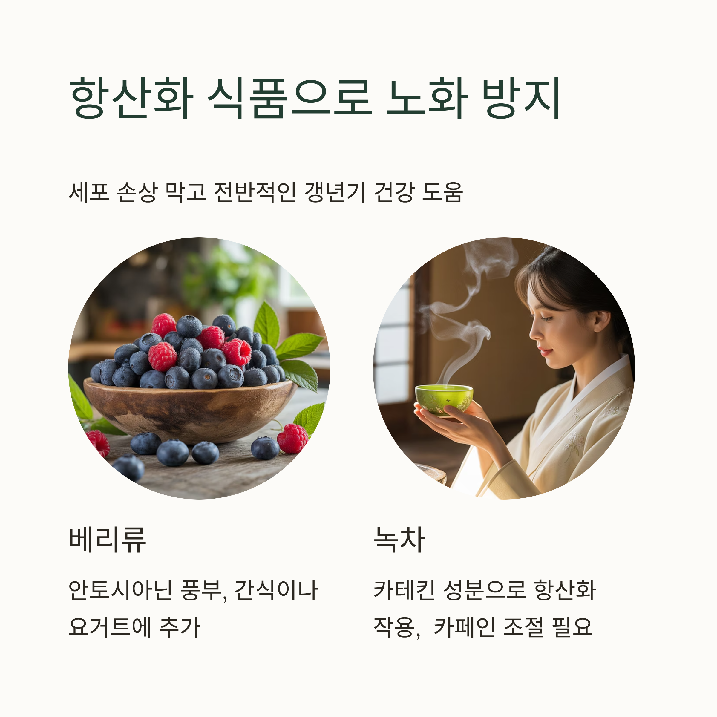 여성호르몬은 아니지만, 항산화 성분은 세포 손상을 막고 노화를 늦춰서 전반적인 갱년기 건강에 도움을 줘요.