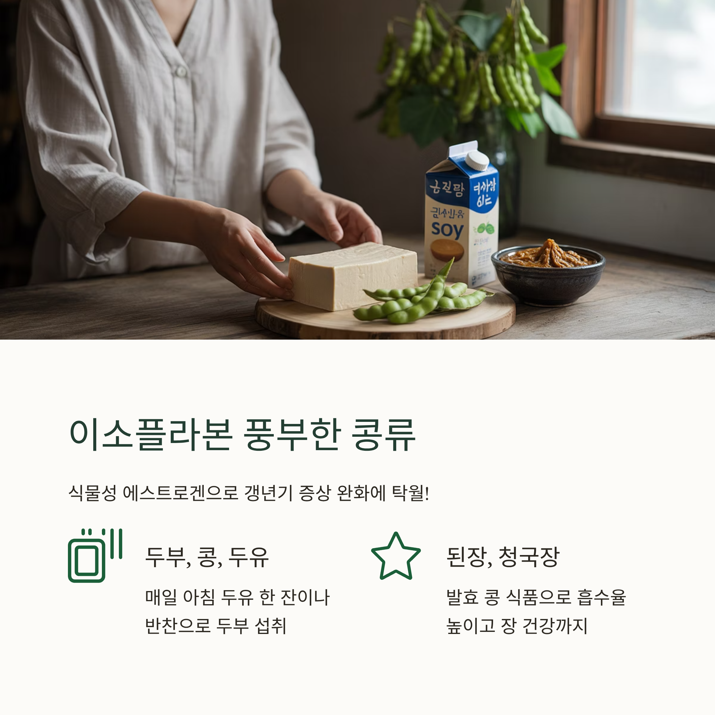 - 된장, 청국장: 발효된 콩 식품은 이소플라본의 흡수율을 높여주고 장 건강에도 도움을 줘요. 한국인에게는 정말 친숙하고 좋은 식재료죠!