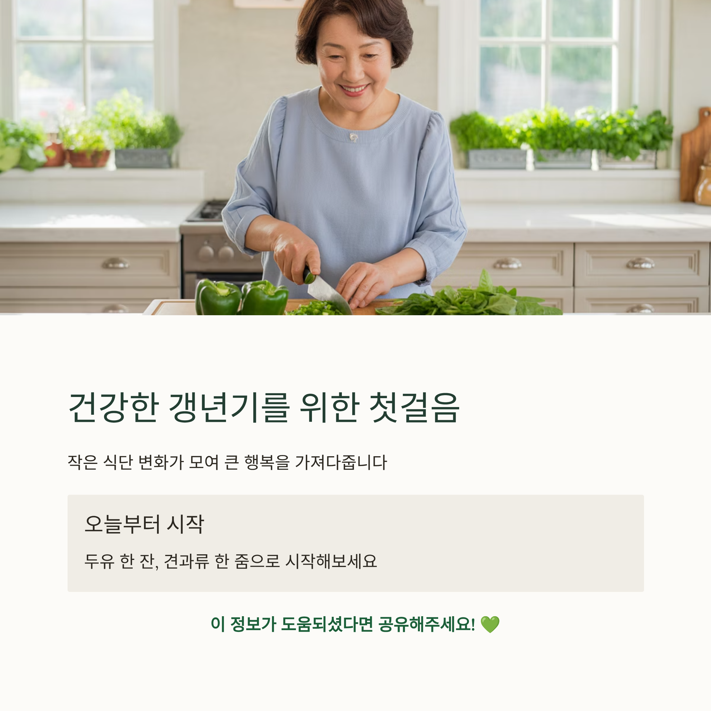 갱년기는 단순히 '노화'가 아니라, 우리 몸이 다음 단계로 나아가는 중요한 전환점이에요. 이 시기를 어떻게 보내느냐에 따라 남은 인생의 건강과 활력이 크게 달라질 수 있다고 생각해요. 오늘 제가 알려드린 음식 리스트를 참고하셔서, 맛있고 건강한 식단으로 여성호르몬을 지키고 더 활기찬 나날을 보내시길 바랍니다! 작은 변화가 모여 큰 행복을 가져다줄 거예요. 😊