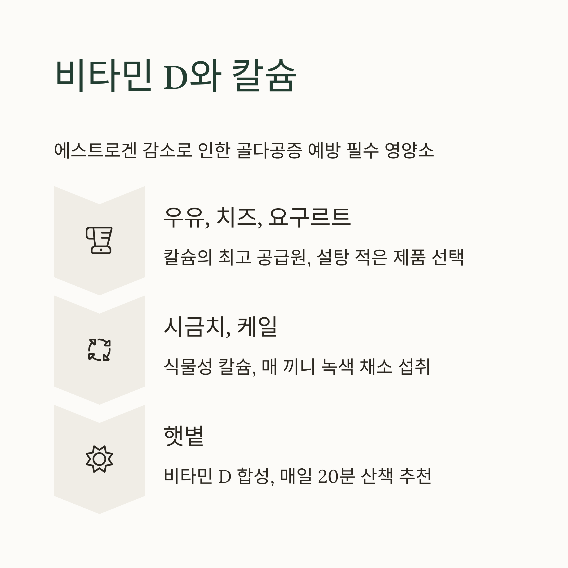 에스트로겐 감소는 골다공증으로 이어지기 쉬워요. 그래서 뼈 건강을 지키는 비타민 D와 칼슘 섭취는 정말 필수적이죠!