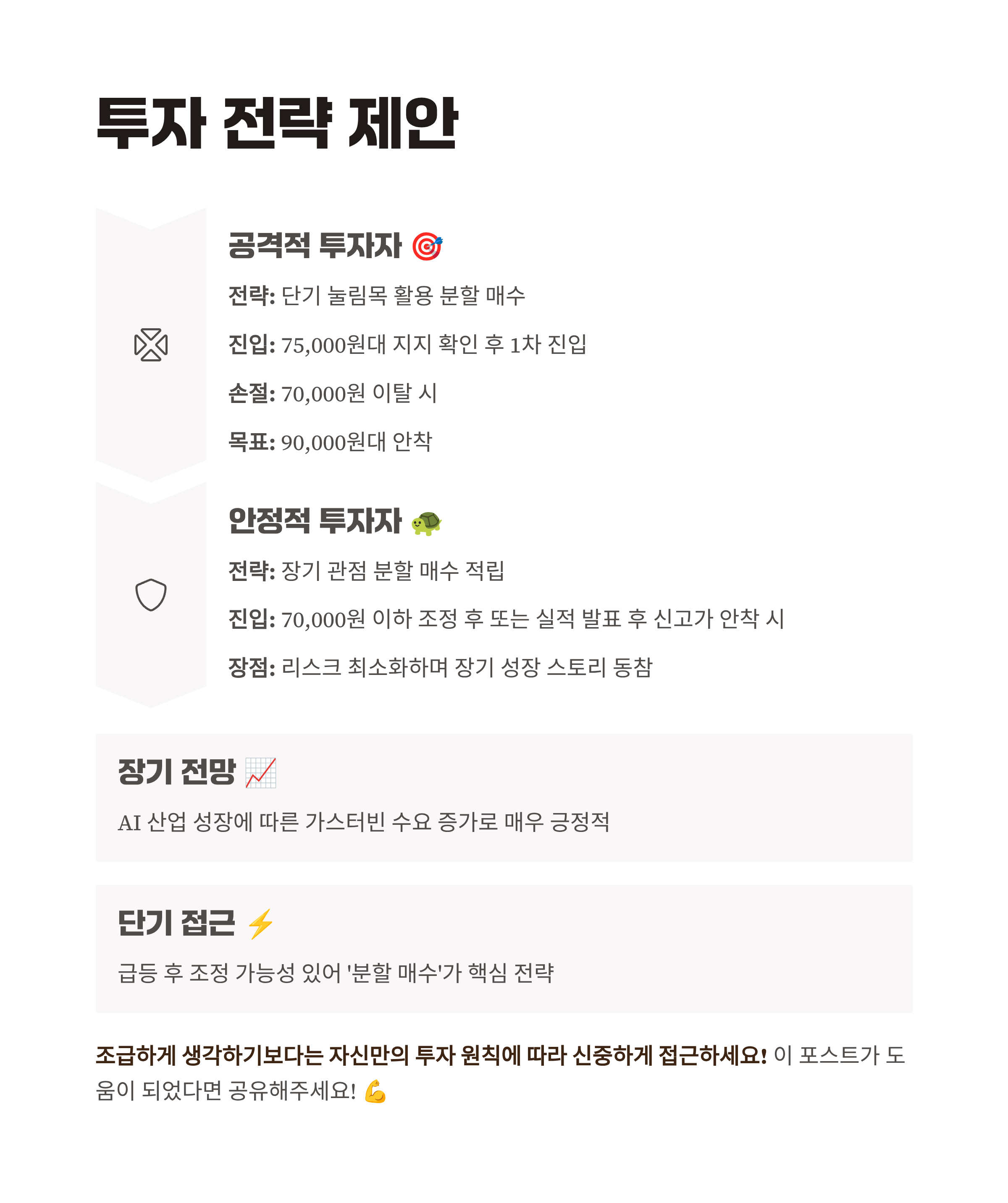 - 진입 시점: 지금 바로 매수하기보다는, 70,000원 이하로 주가가 충분히 조정받아 안정화되거나, 혹은 뚜렷한 실적 발표와 함께 추세적인 신고가 안착을 본 뒤에 비중을 늘려가도 늦지 않습니다.