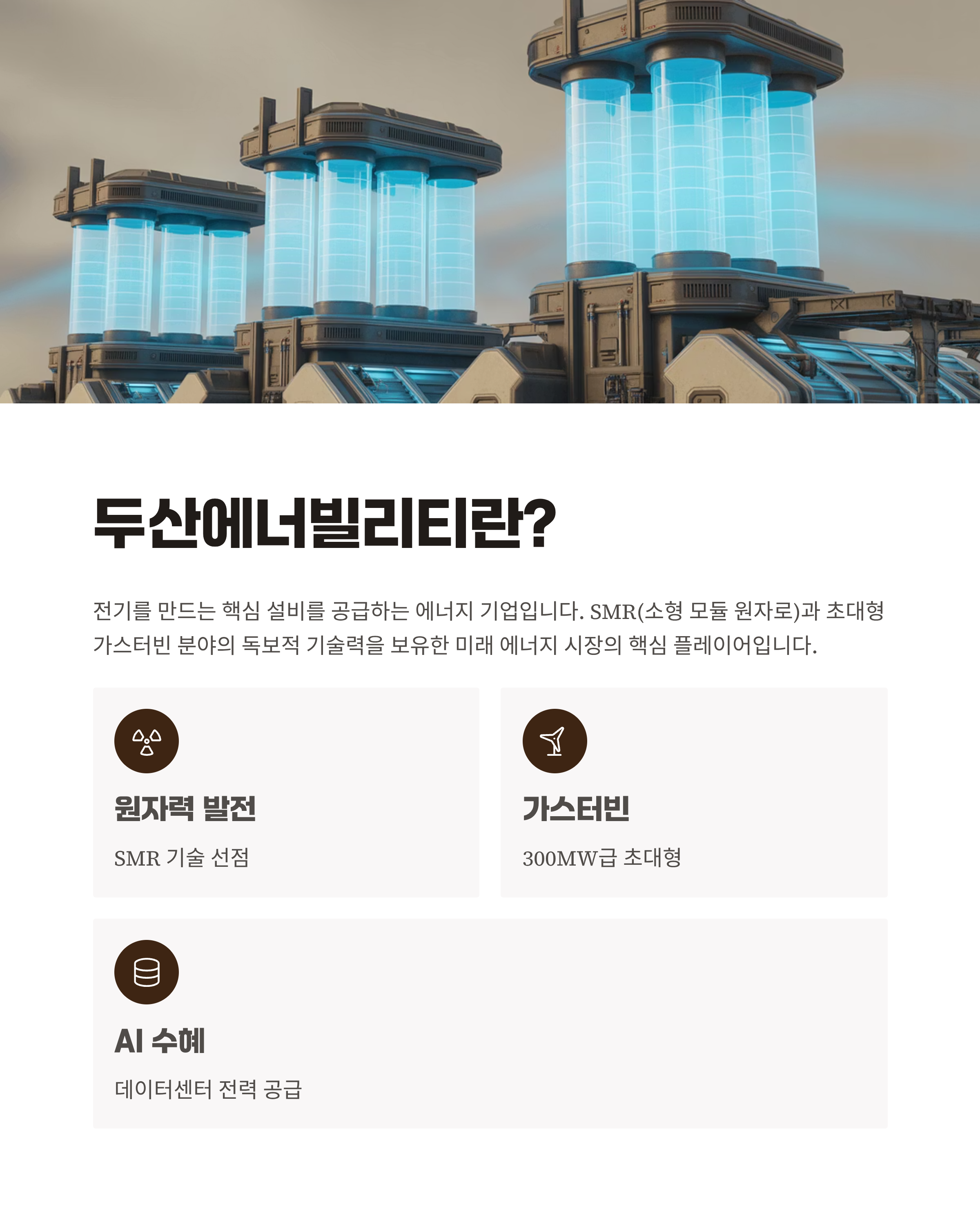 [핵심 사업] "자, 먼저 두산에너빌리티가 대체 뭐 해서 돈을 버는 회사인지부터 간단히 알아볼까요? 어렵게 생각할 것 없이, 이 회사는 크게 원자력 발전과 가스터빈을 포함한 다양한 에너지 관련 사업을 한다고 보시면 됩니다. 쉽게 말해 전기를 만들고 공급하는 데 필요한 핵심 설비를 공급하는 기업입니다. 특히 SMR(소형 모듈 원자로)과 초대형 가스터빈 분야에서 독보적인 기술력을 보유하고 있어 미래 에너지 시장의 핵심 플레이어라고 할 수 있습니다."