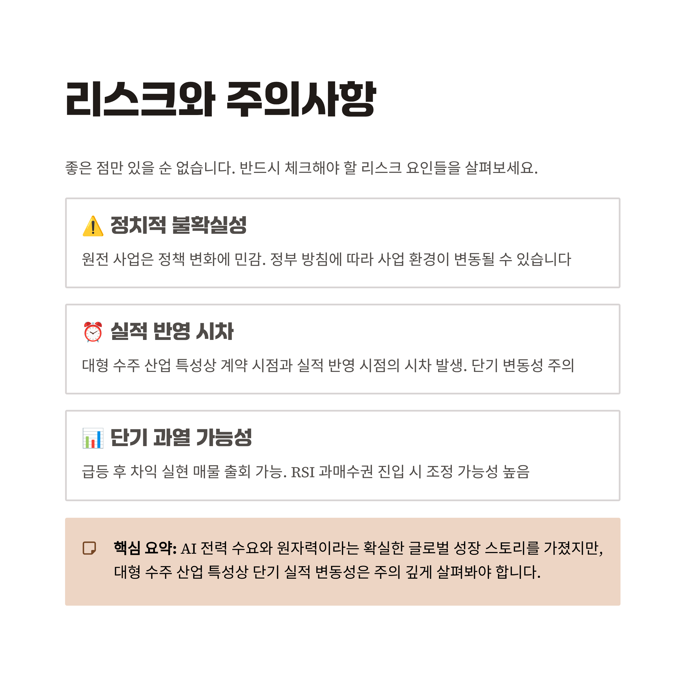 "물론 좋은 점만 있을 순 없겠죠? 우리가 반드시 체크하고 넘어가야 할 리스크 요인도 있습니다. 바로 정치적 불확실성 문제입니다. 원전 사업의 경우 정책 변화에 민감하며, 대형 수주 산업의 특성상 수주 시점과 실제 실적 반영 시점의 시차가 발생할 수 있습니다. 이는 단기적인 변동성을 키우는 요인이 될 수 있습니다."