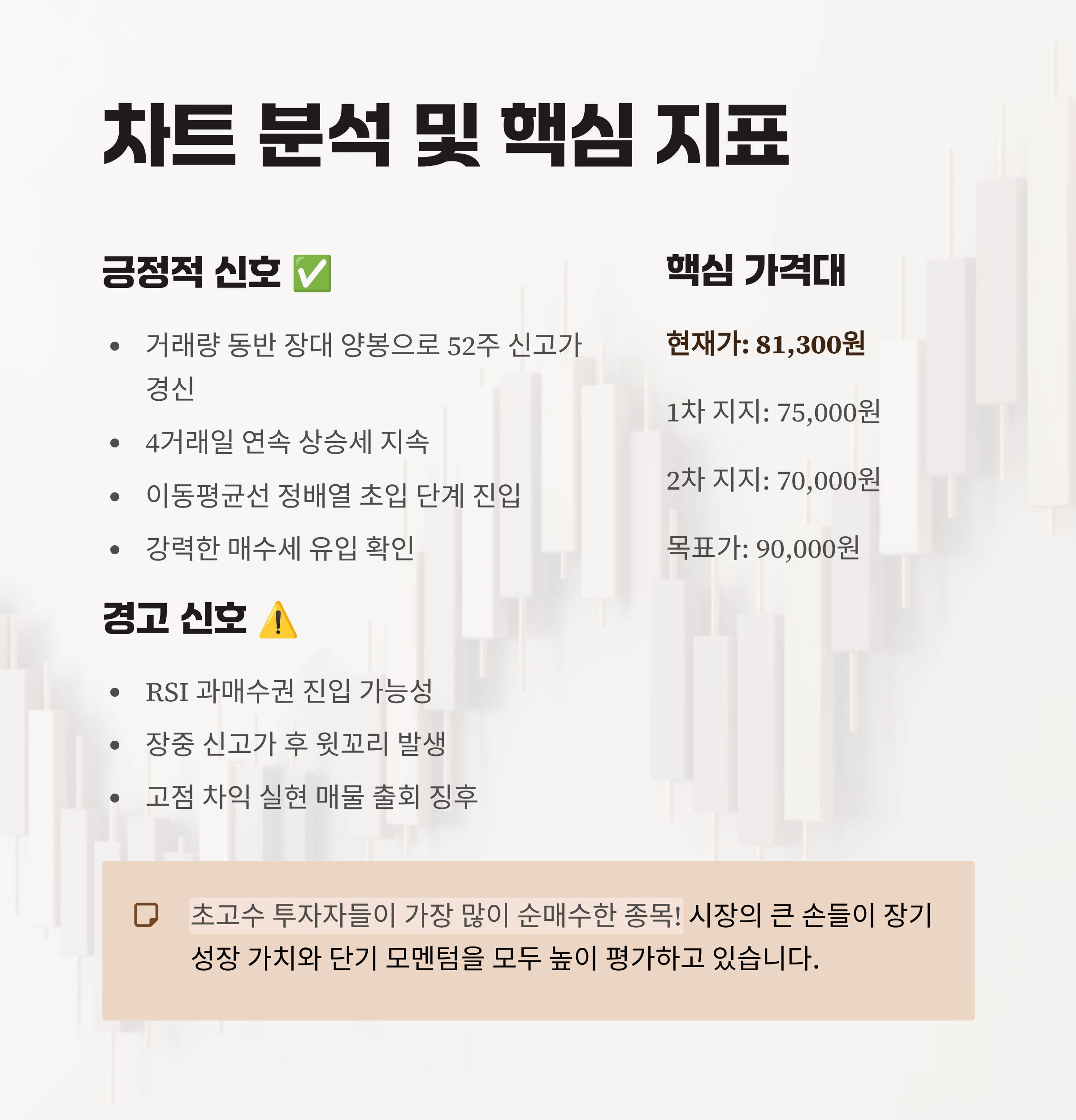 "하지만 방심은 금물입니다. 차트가 우리에게 보내는 경고 신호도 분명히 있거든요. 주가 급등으로 인해 단기 과열 신호(RSI 과매수권 진입)가 나타날 가능성이 높습니다. 또한, 장중 신고가(82,000원) 이후 윗꼬리를 달고 내려오는 모습은 고점에서 차익 실현 매물이 일부 출회되고 있음을 시사합니다. 따라서, 무리한 추격 매수보다는 눌림목을 기다리는 전략이 필요합니다."