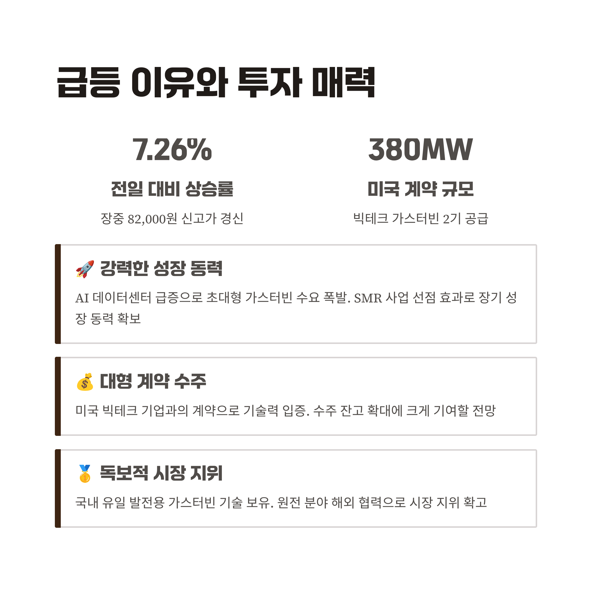 - 🚀 강력한 성장 동력: AI 데이터센터 급증에 따른 초대형 가스터빈 수요 폭발과 SMR 사업 선점 효과가 맞물려 장기적인 성장 동력을 확보했습니다.