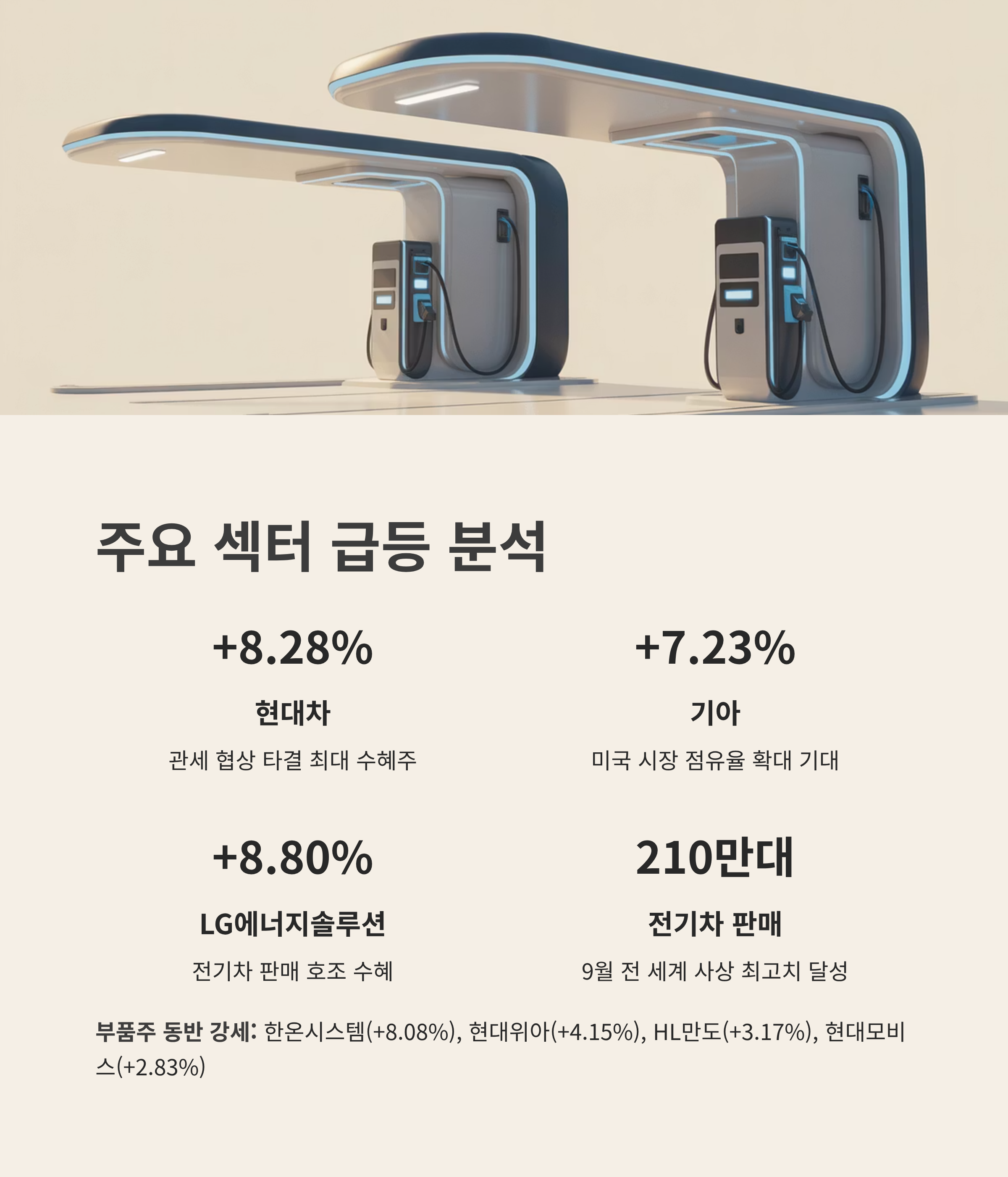 관세 협상 타결 기대감 외에도, 9월 전 세계 전기차 판매량이 사상 최고치(210만 대)를 달성했다는 소식도 자동차주의 전기차 부문에 긍정적 영향을 주며 상승 동력을 더했습니다.