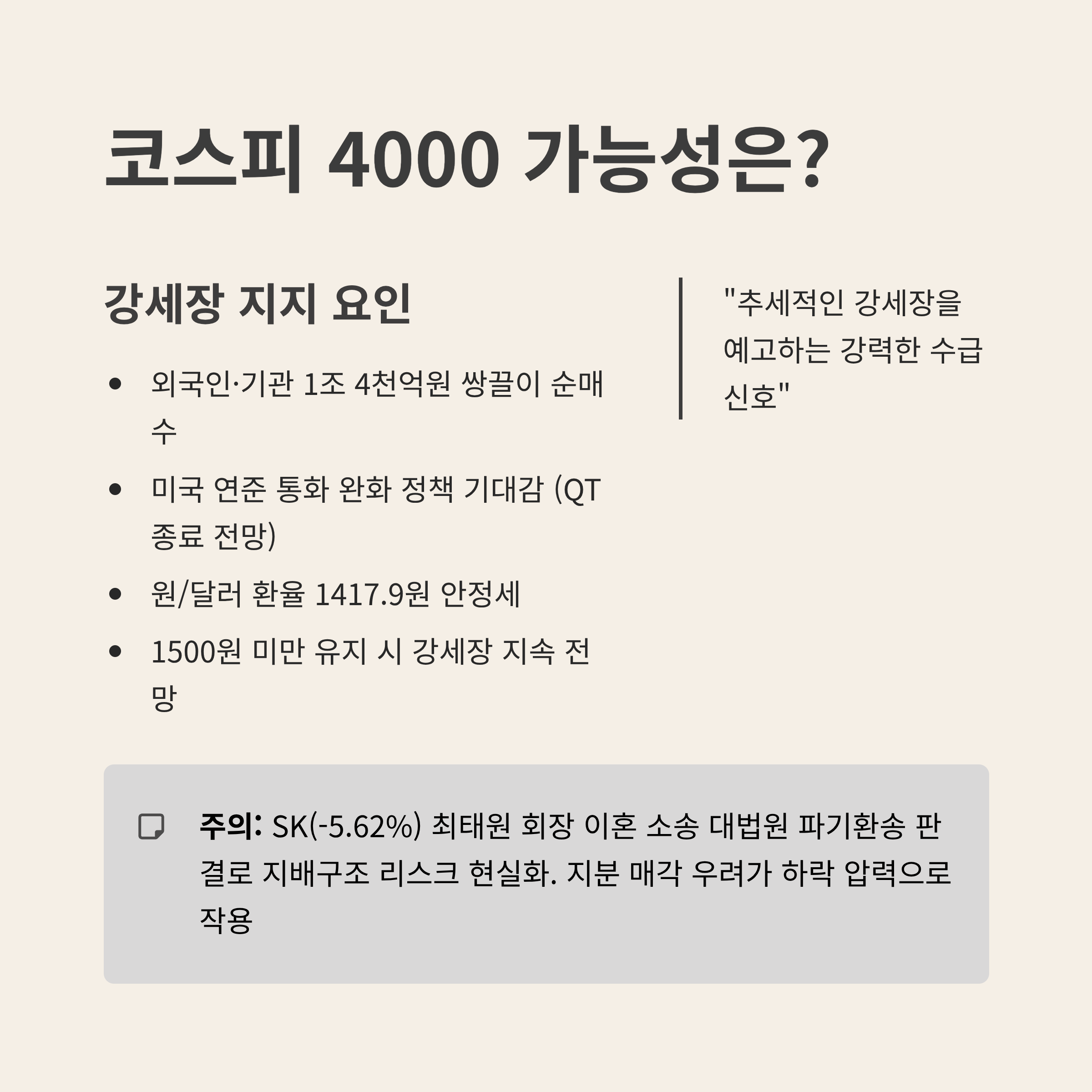 첫째, 미국 연준의 통화 완화 정책 기대감입니다 (QT 종료 전망). 금리 진정은 증시 밸류에이션을 높이는 핵심 요인입니다. 둘째, 원/달러 환율이 1417.9원으로 안정세를 보이며, 1500원을 넘지 않는 이상 강세장 분위기는 쉽게 뒤집히지 않을 것이라는 분석이 지배적입니다.