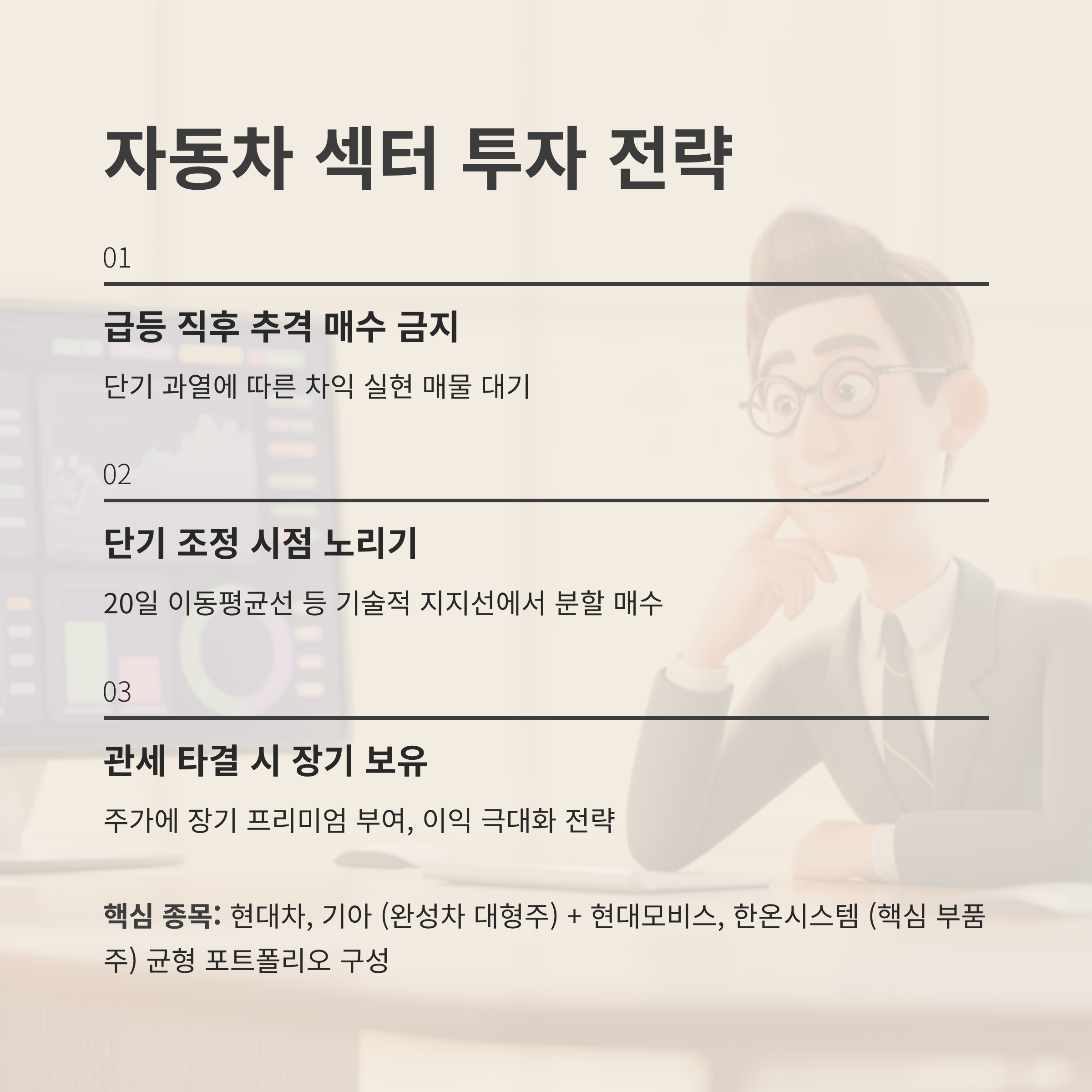 | 관세 최종 타결 시 | 주가에 장기 프리미엄 부여 | 장기 보유를 통한 이익 극대화 |