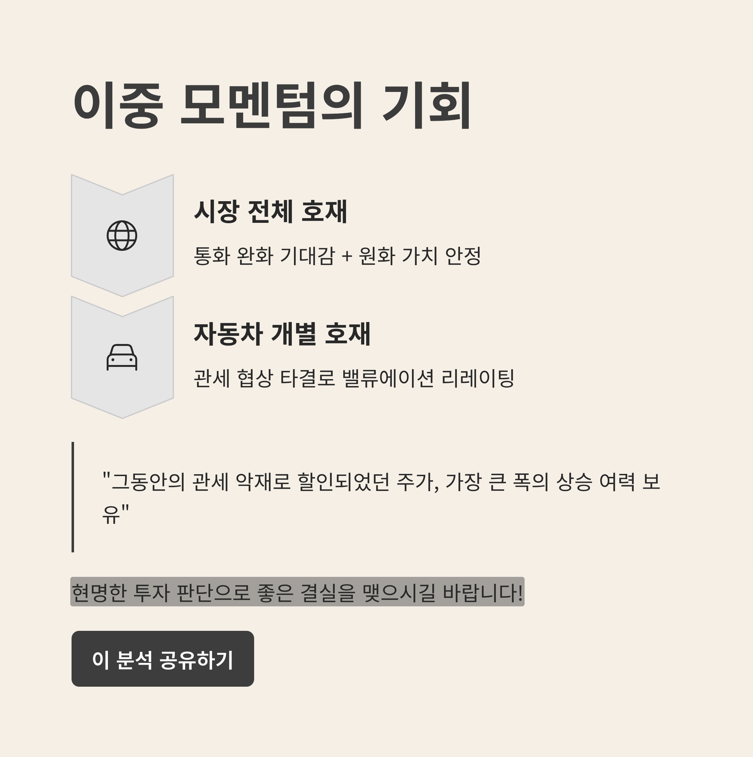 증시 강세장의 배경인 통화 완화 기대감과 원화 가치 안정은 시장 전체에 긍정적이지만, 자동차주는 여기에 개별 업종 호재까지 더해진 '이중 모멘텀'을 가지고 있습니다.