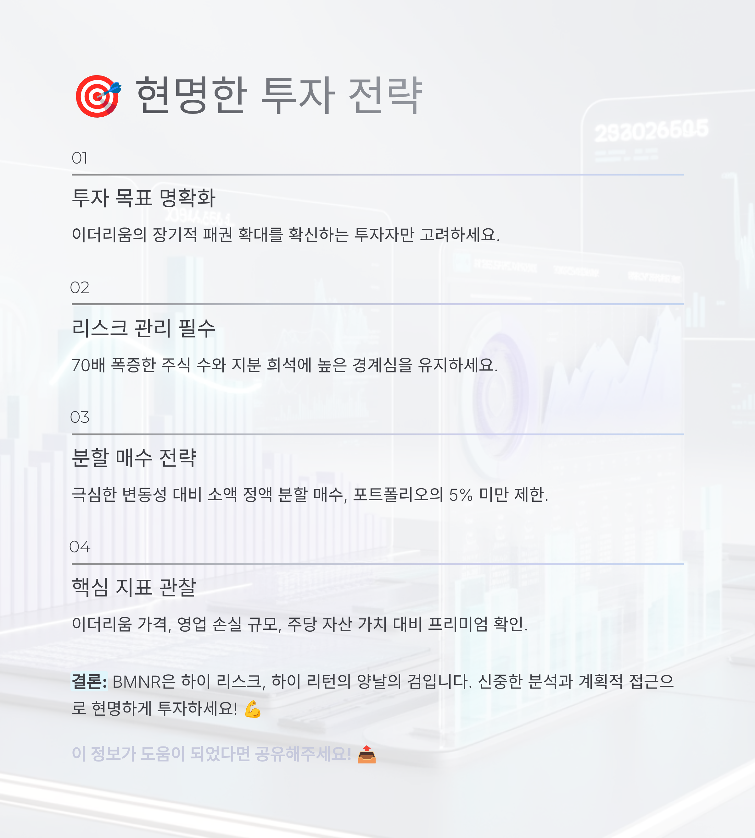 BMNR은 포트폴리오의 극히 일부, 즉 '하이 리스크, 하이 리턴'을 추구하는 자금으로만 접근해야 합니다. 주가 변동성이 극심하므로 투자 시점 분산이 필수입니다.