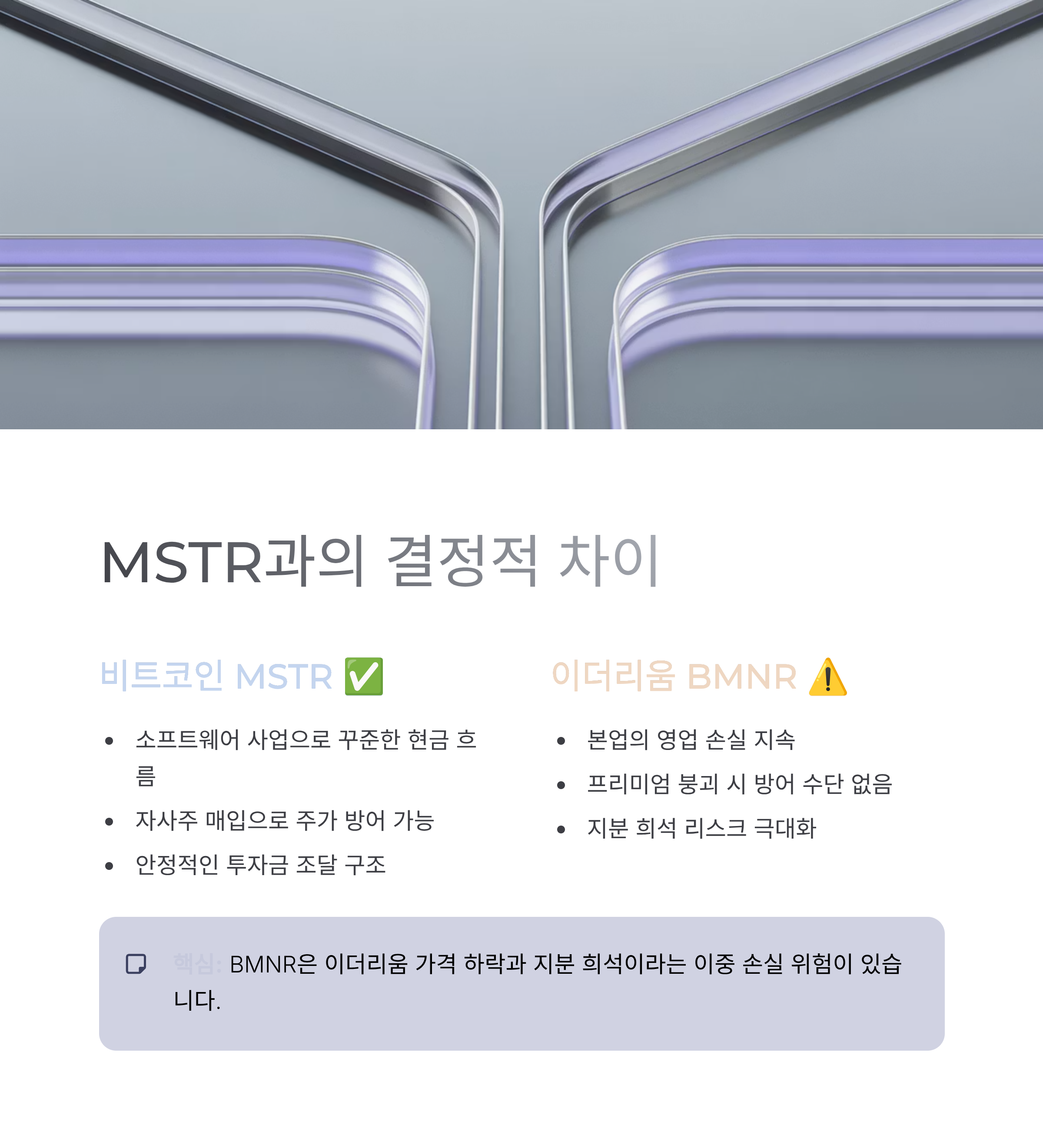 비트코인 MSTR은 소프트웨어 사업으로 꾸준한 현금 흐름이 있어 자사주 매입을 통한 주가 방어 및 투자금 조달이 가능합니다. 반면 BMNR은 본업의 영업 손실 때문에 '프리미엄'이 무너지면 희석을 막을 방패가 없다는 점이 가장 큰 리스크입니다.