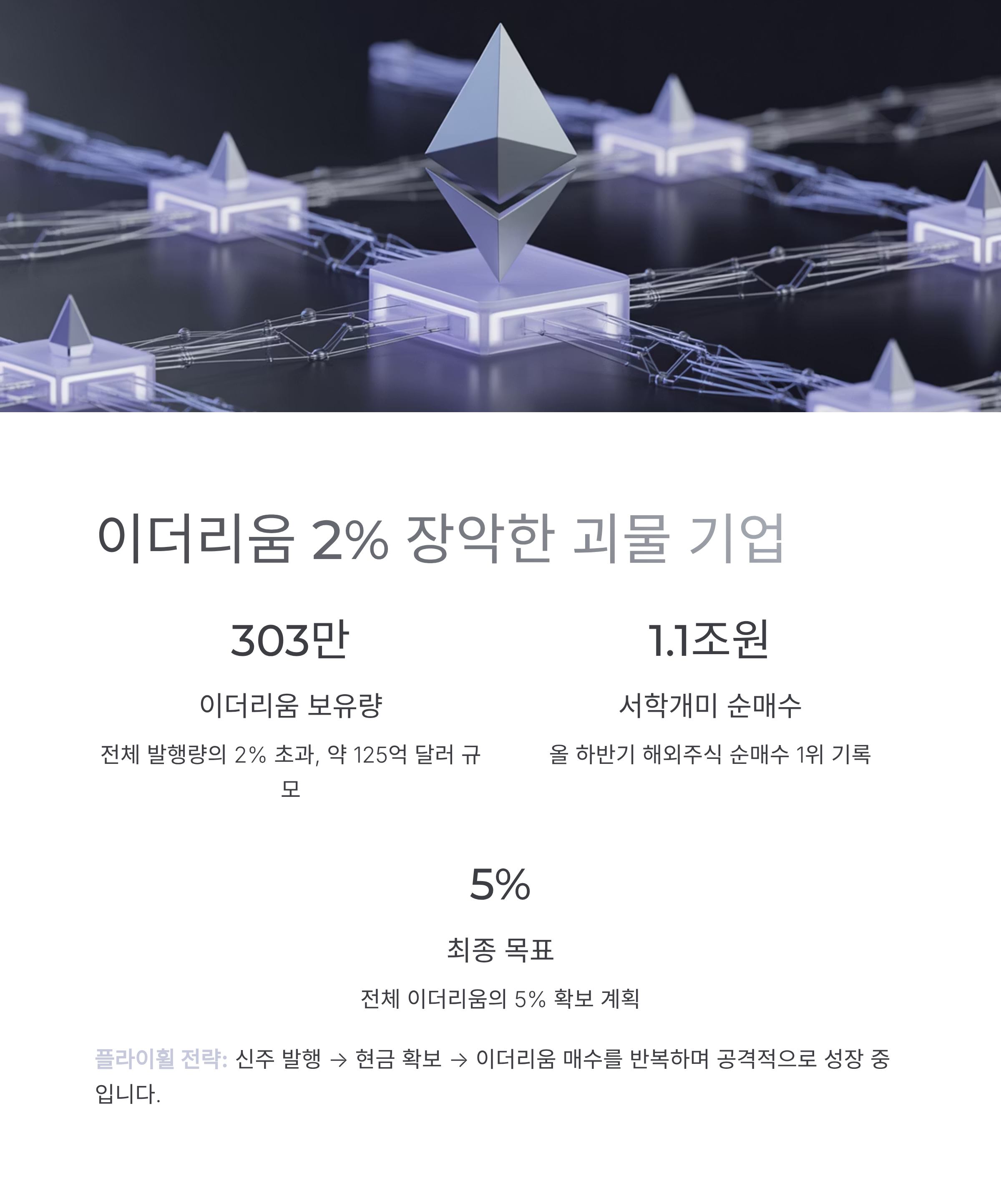 [핵심 전략: 플라이휠(Flywheel) 모델] BMNR은 '신주 발행/CB 발행 → 현금 확보 → 이더리움 매수'를 반복하는 플라이휠 전략을 사용합니다. 이를 통해 현재 이더리움 발행량의 2%가 넘는 303만 개(약 125억 달러)를 확보했으며, 목표는 전체 이더리움의 5%입니다.