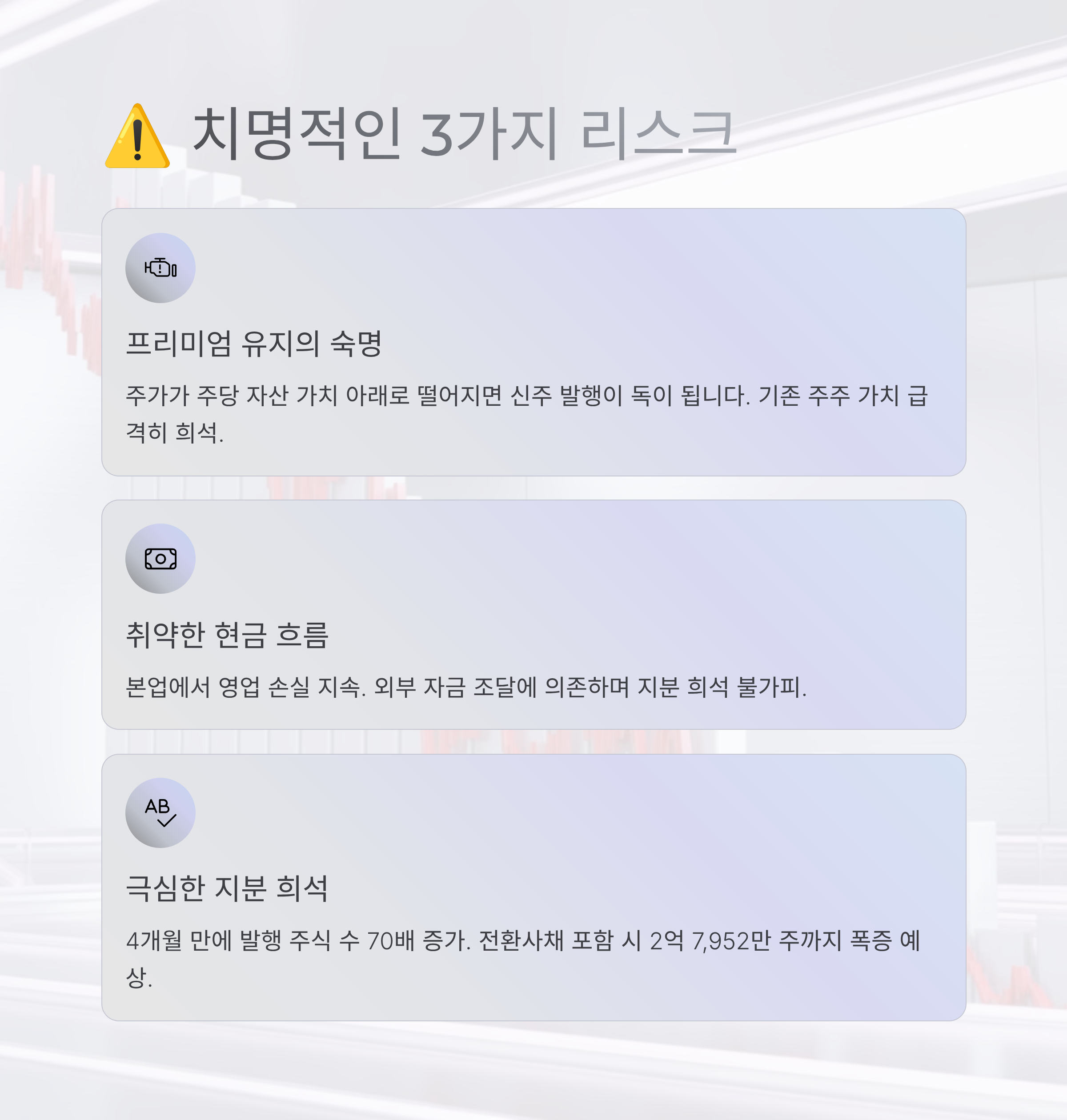 | 발행 주식 증가 (6월~) | 약 70배 증가 (1.73억 주) | 지속적인 주주 가치 희석 리스크 |