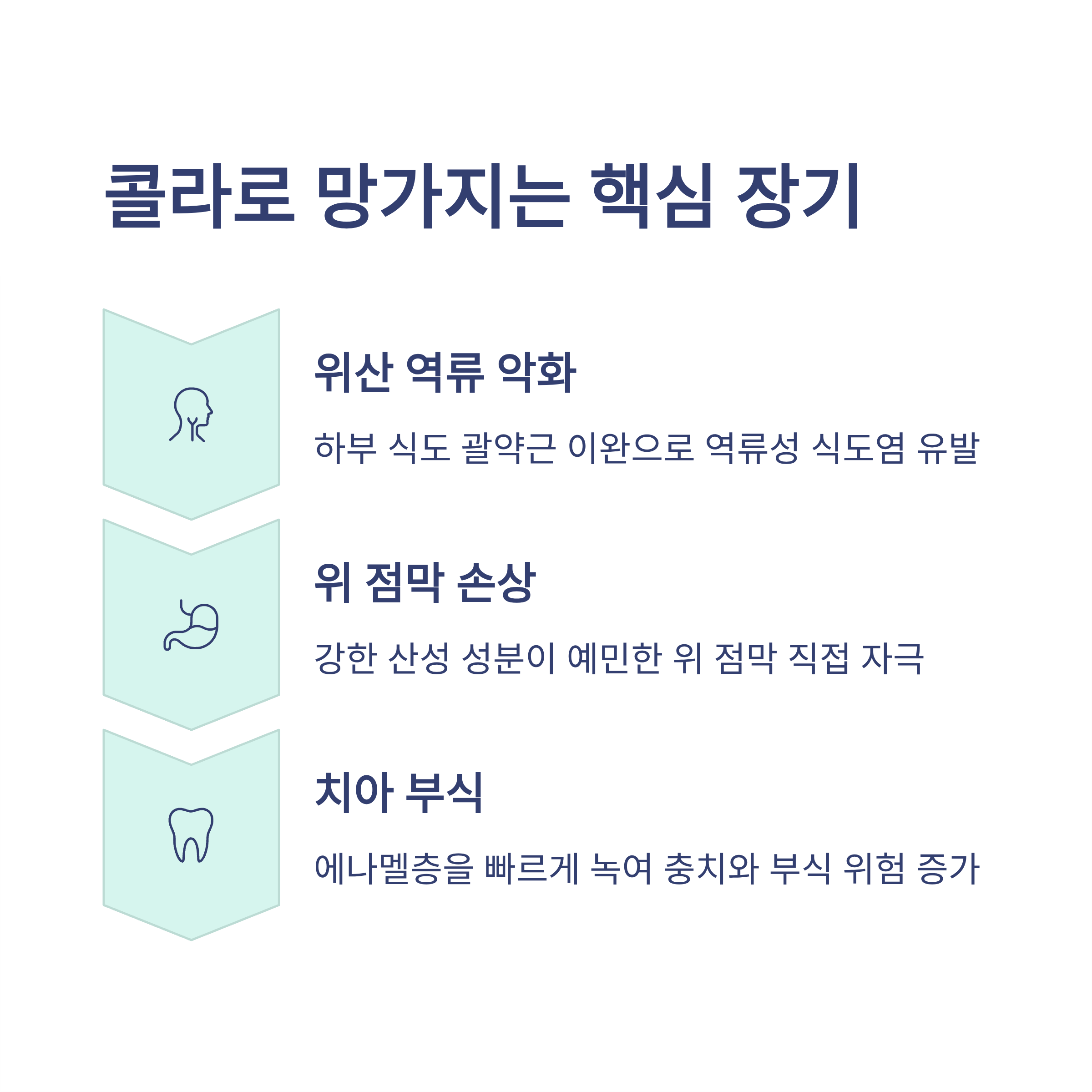 - 3. 치아 부식: 소화기관은 아니지만, 콜라의 산성은 치아 표면의 에나멜층을 빠르게 녹입니다. 콜라를 천천히 홀짝이는 습관은 치아 전체를 산성 환경에 장시간 노출시키는 것과 같아 충치와 부식의 지름길이 됩니다.