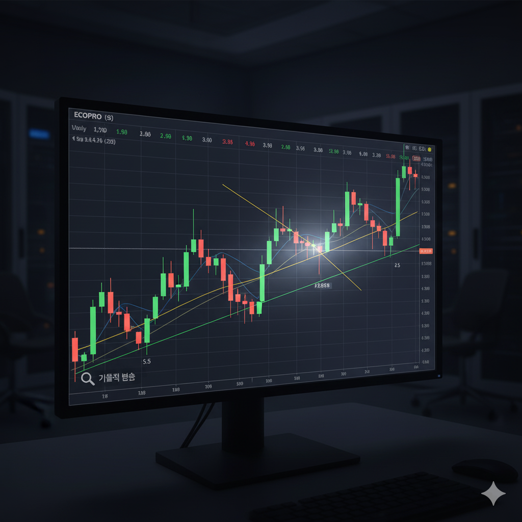 자, 이제 펀더멘탈의 '기대감'이 주가에 어떻게 반영되고 있는지 차트를 통해 확인해 볼 시간입니다. 오늘 에코프로는 장중 24%가 넘는 급등을 보이며, 강력한 매수세가 유입되었음을 차트가 증명하고 있습니다.