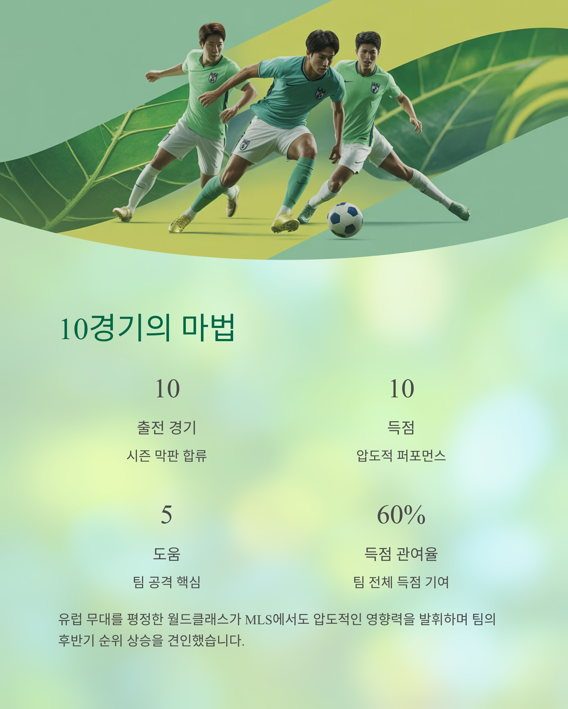 - 핵심 사항 1 (활약): 단 10경기 만에 10골 5도움(가정)이라는 압도적인 공격 포인트를 기록하며 MLS 무대를 정복했습니다.