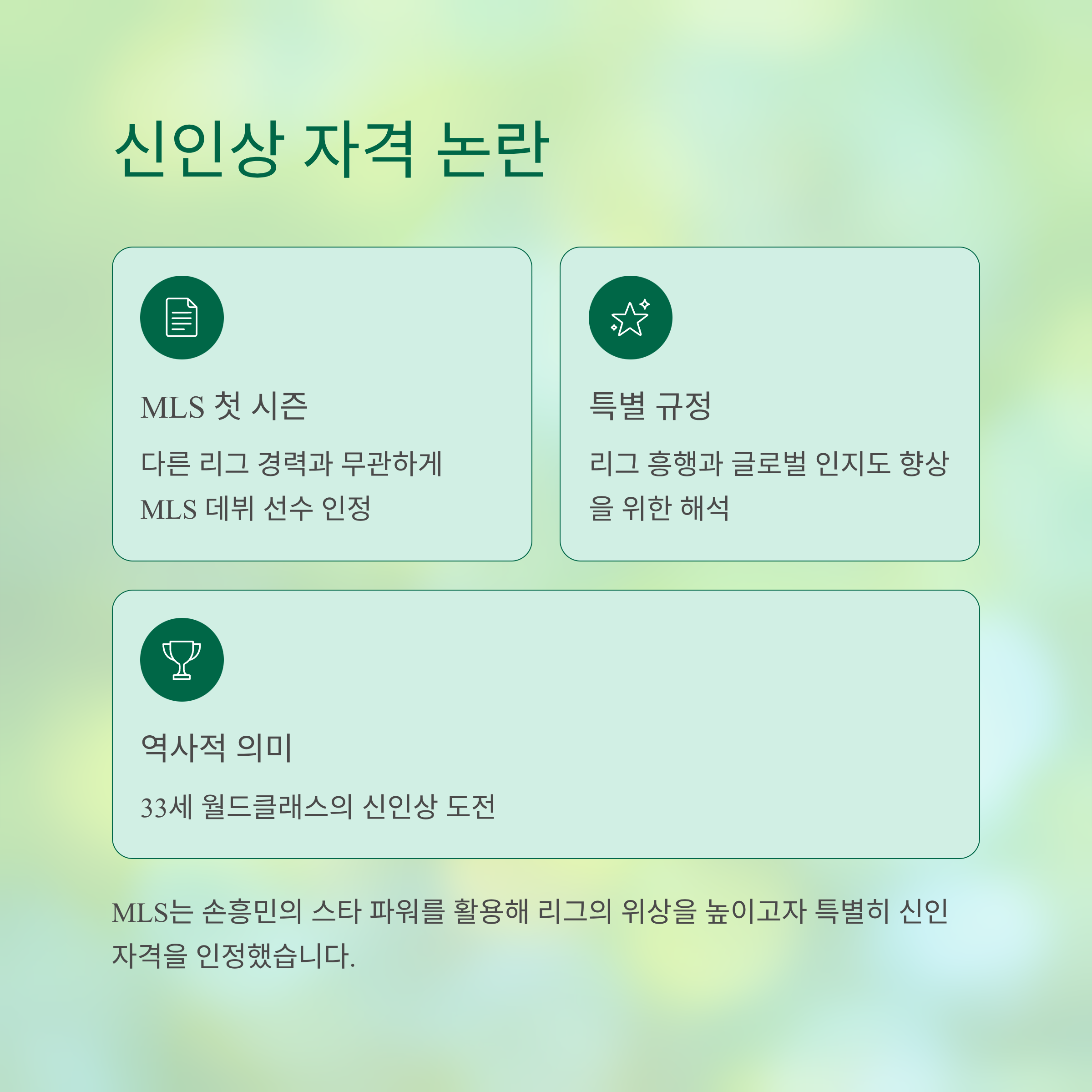 결국, 리그의 글로벌 인지도 향상이라는 대의명분 아래, 손흥민 선수의 MLS 데뷔 시즌 자체가 '신인'의 범위에 포함될 수 있도록 특별히 해석된 것으로 보입니다. 이는 MLS가 얼마나 손흥민이라는 스타 파워를 필요로 했는지를 보여주는 방증이기도 하죠.