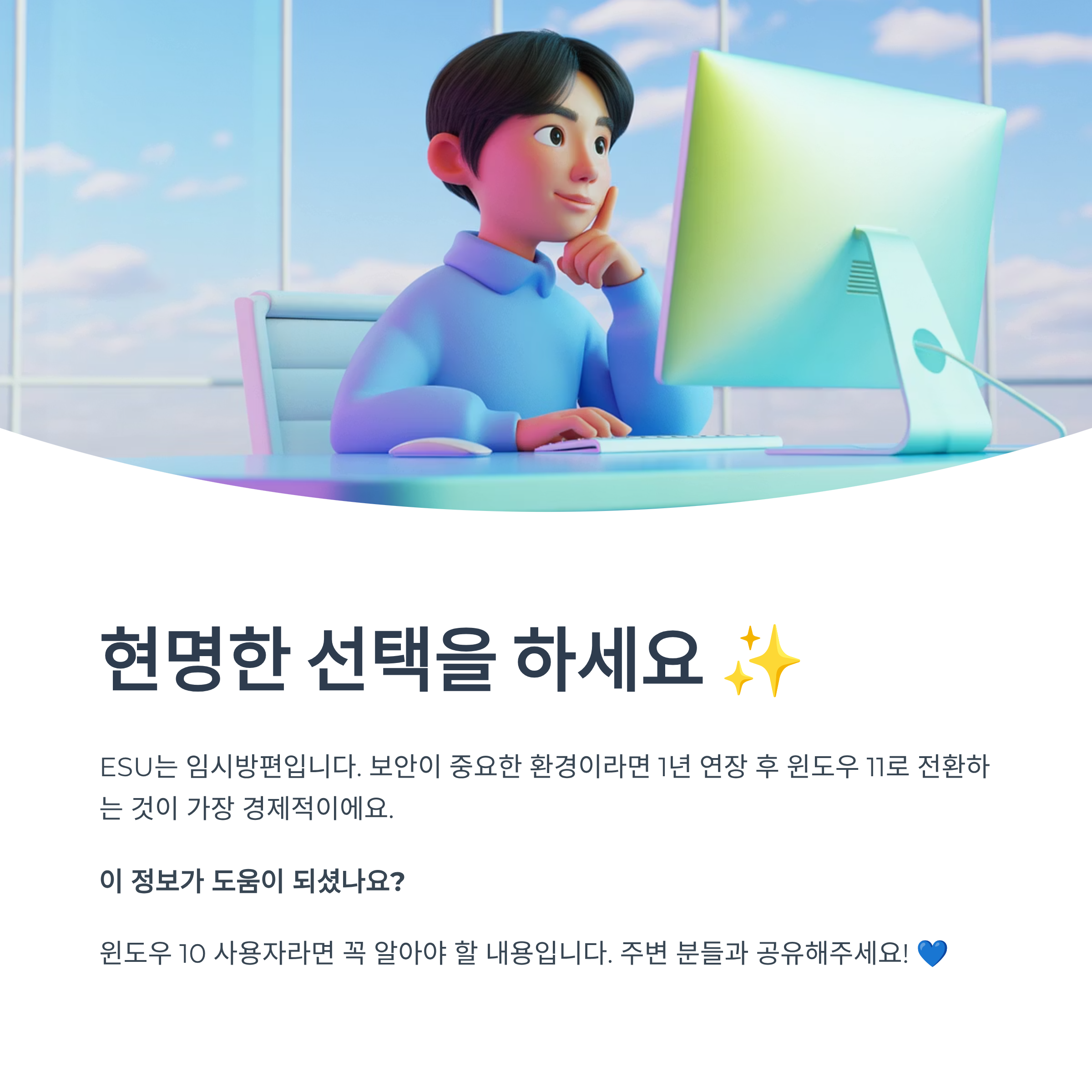 윈도우 10 ESU는 당장 윈도우 11로 넘어가기 어려운 특정 사용자들을 위한 '시간 벌기' 옵션이라고 생각하는 게 가장 정확합니다. 연장 비용이 결코 만만치 않으니, 이 글에서 알려드린 비용 구조와 유의사항을 꼼꼼히 체크하셔서 가장 합리적인 결정을 내리시길 바랍니다. 현명한 선택을 응원합니다! 😊