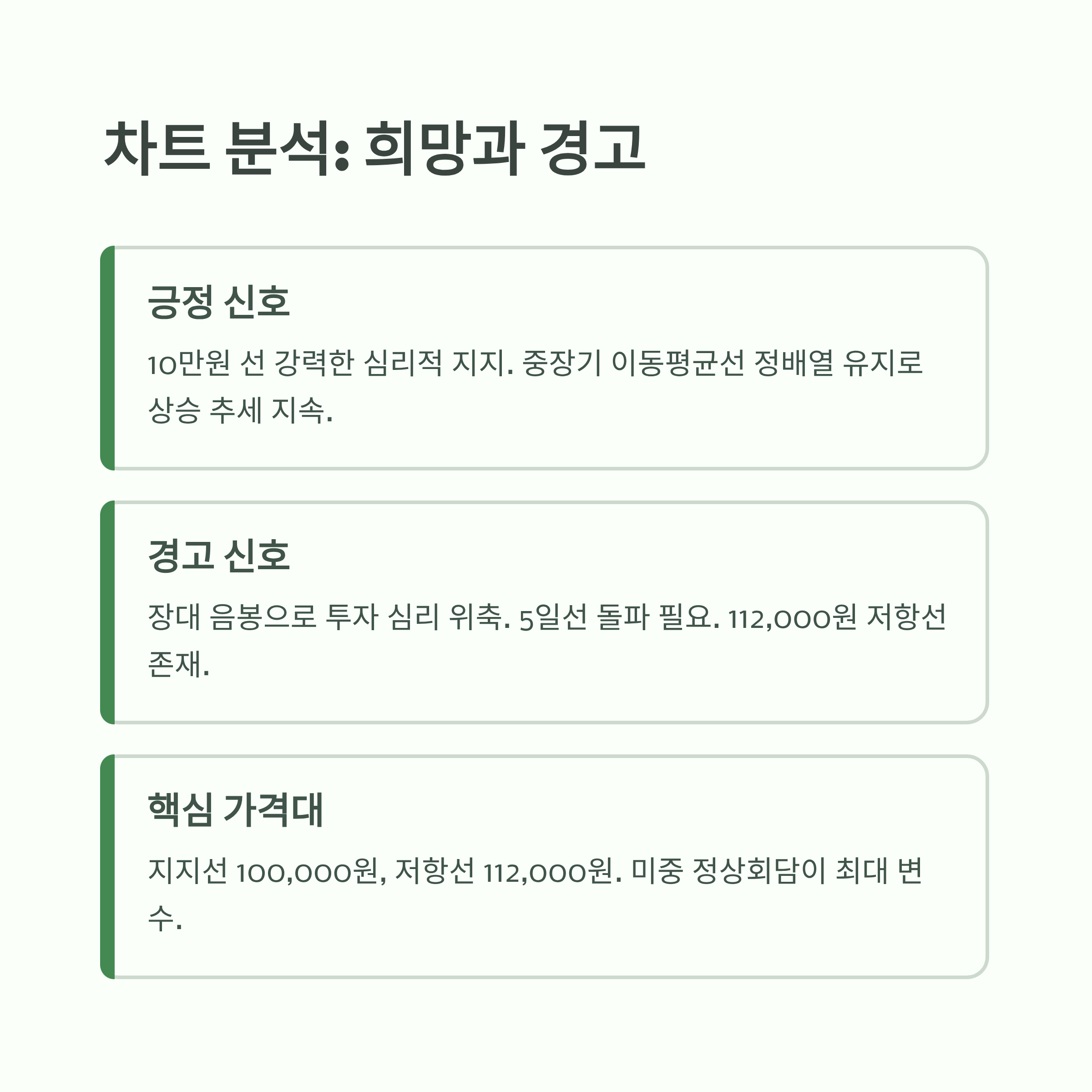 | 단기 지지선 | 심리적/기술적 지지대 | 100,000원 | 이탈 시 추가 하락 우려 |