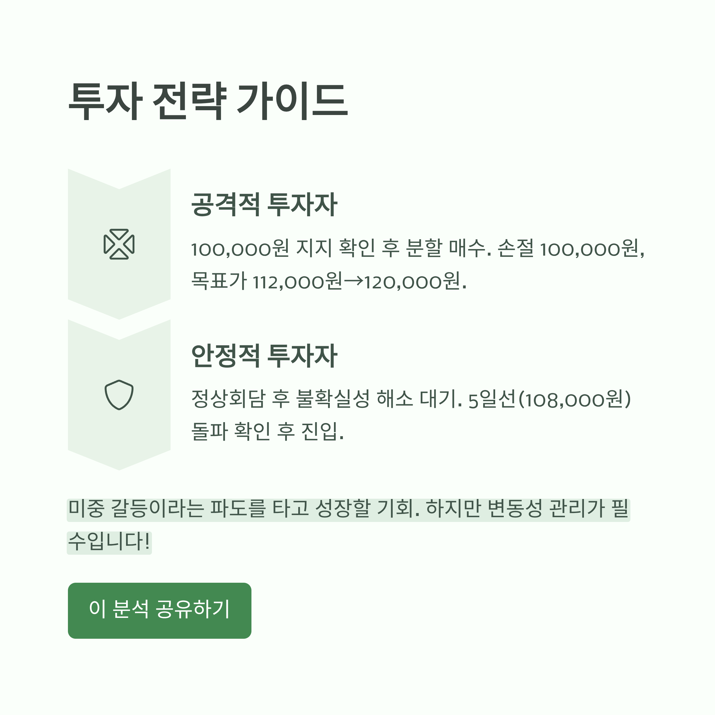 - 손절 라인: 심리적 지지선인 100,000원이 무너지면 일단 후퇴하는 것이 안전합니다. 이는 더 큰 악재(갈등 확전 등)의 신호일 수 있습니다.