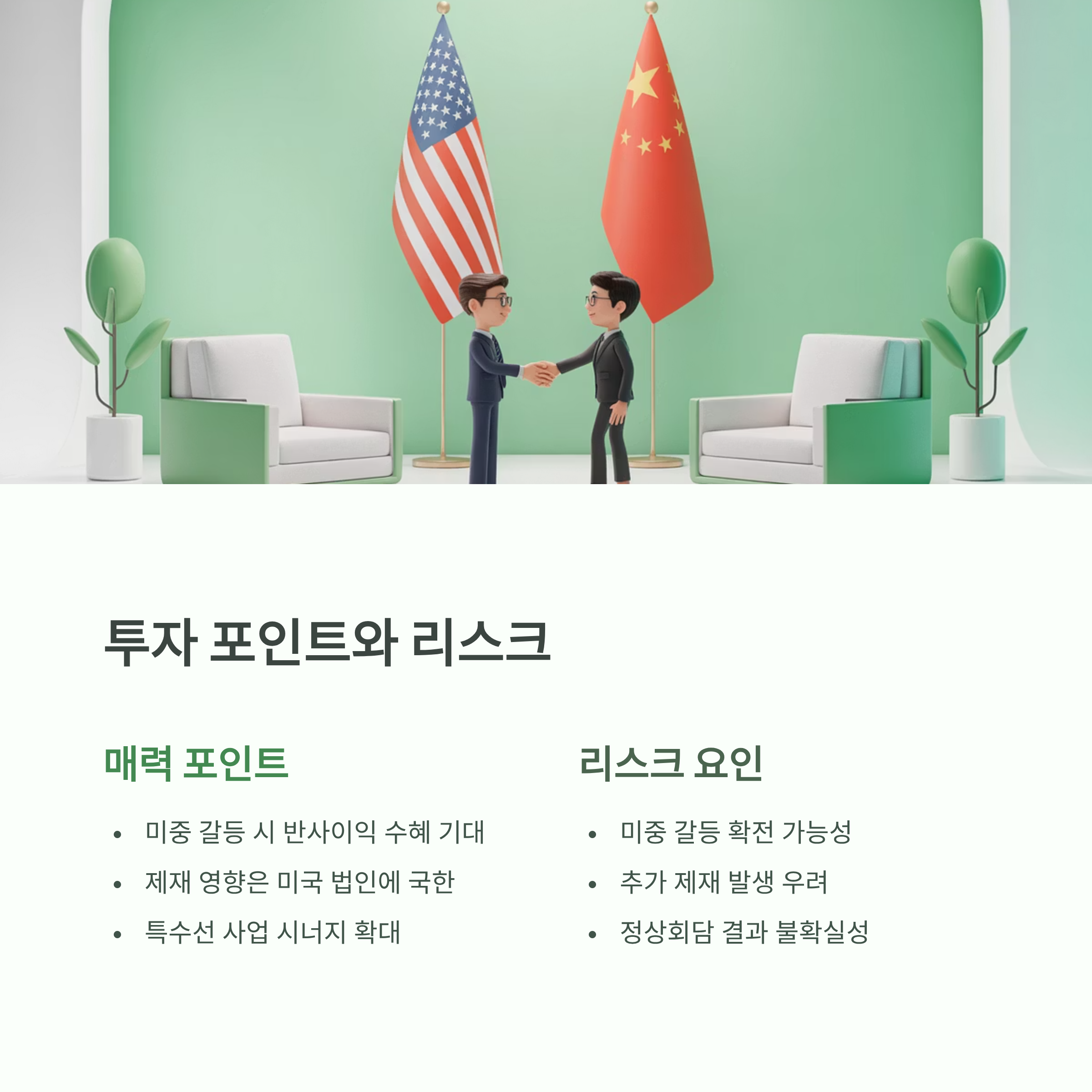 "물론 좋은 점만 있을 순 없겠죠? 우리가 반드시 체크하고 넘어가야 할 리스크 요인도 있습니다. 바로 미중 갈등의 확전 가능성 문제입니다. 이는 관리된 갈등 수준에 그칠지, 아니면 양국 간 제재 범위를 확대하는 '확전'으로 이어질지 예측하기 어렵다는 변수가 존재합니다. 대외 메시지 성격의 추가 제재도 염두에 두어야 합니다."
