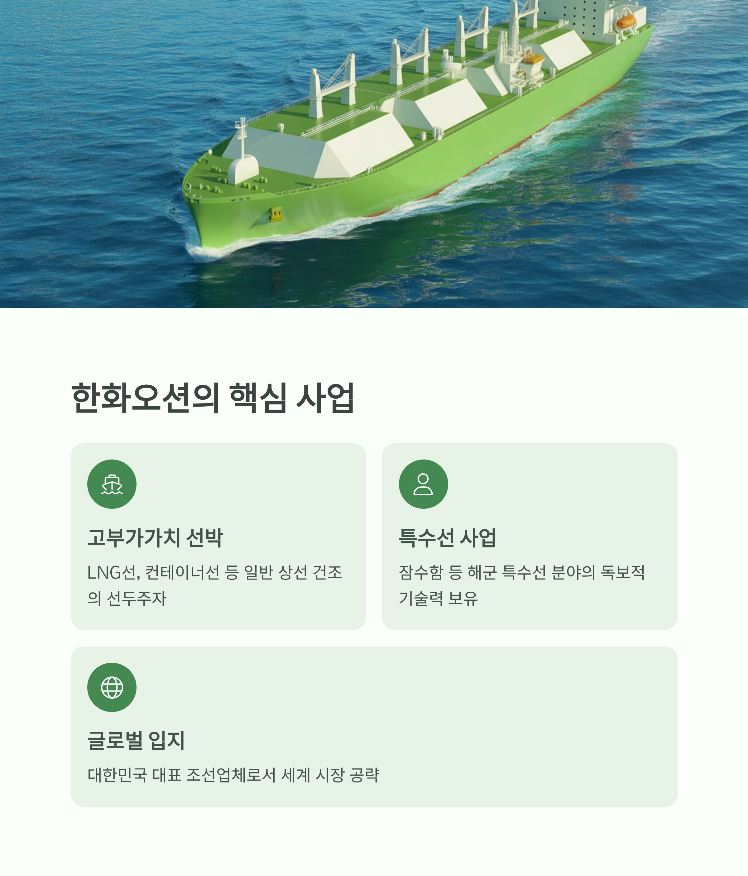 [핵심 사업] "자, 먼저 한화오션이 대체 뭐 해서 돈을 버는 회사인지부터 간단히 알아볼까요? 어렵게 생각할 것 없이, 이 회사는 크게 고부가가치 선박 건조와 특수선 사업을 한다고 보시면 됩니다. 쉽게 말해 LNG선, 컨테이너선 같은 일반 상선 시장은 물론, 잠수함과 같은 해군 특수선 분야에서도 독보적인 기술력을 가진 대한민국 대표 조선업체입니다."