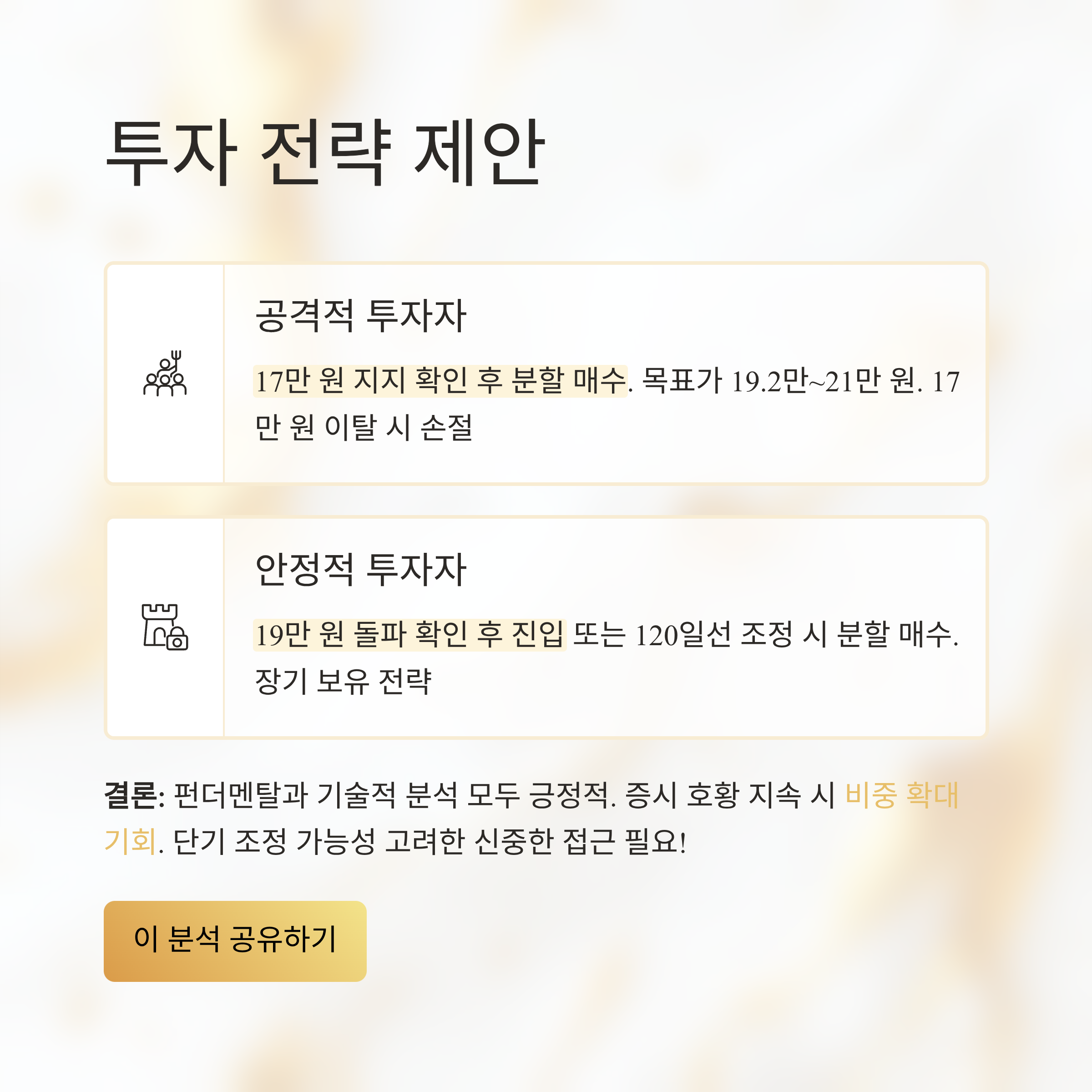 펀더멘탈의 강점이 확실한 만큼, 투자 성향에 따라 아래와 같은 전략을 고려해 볼 수 있습니다.