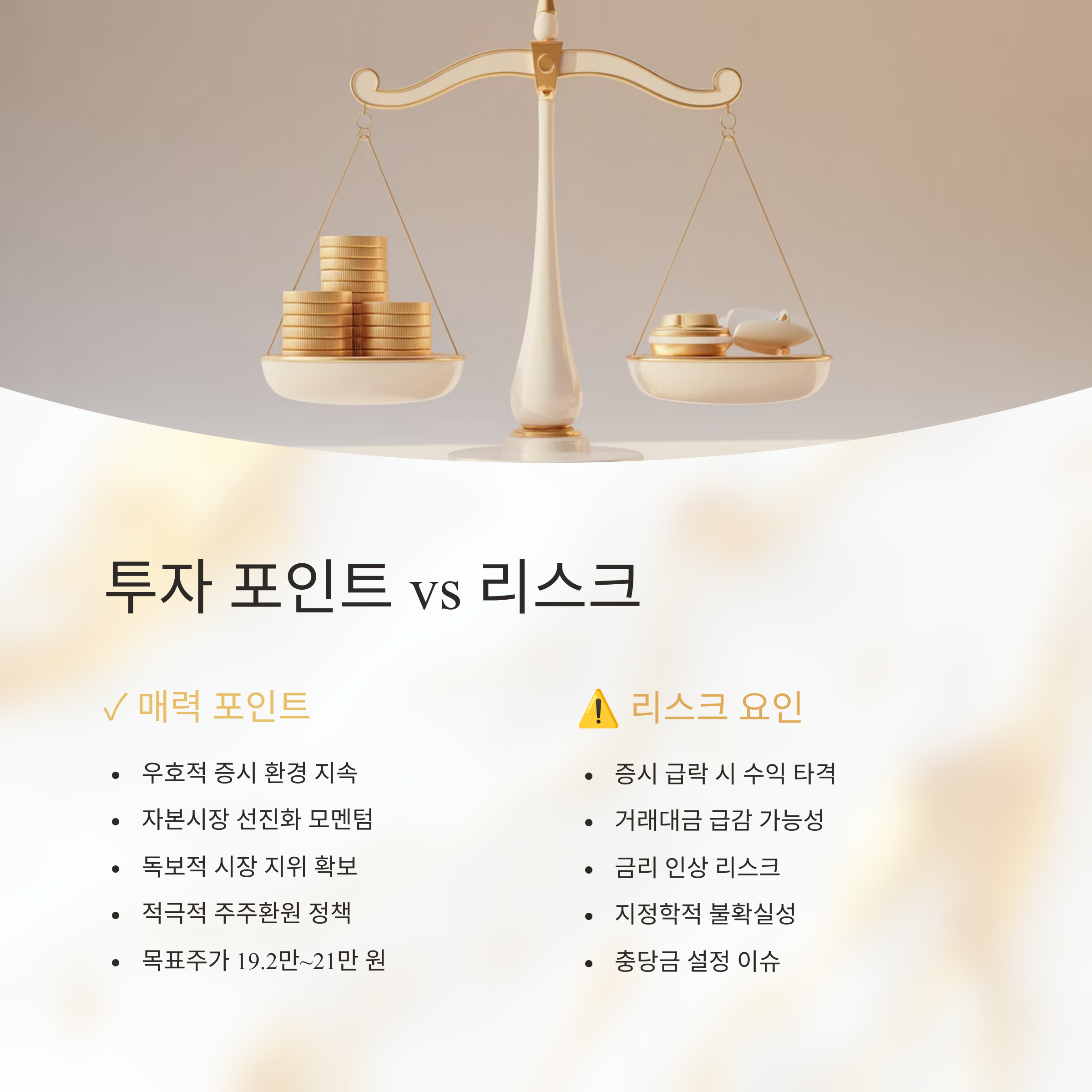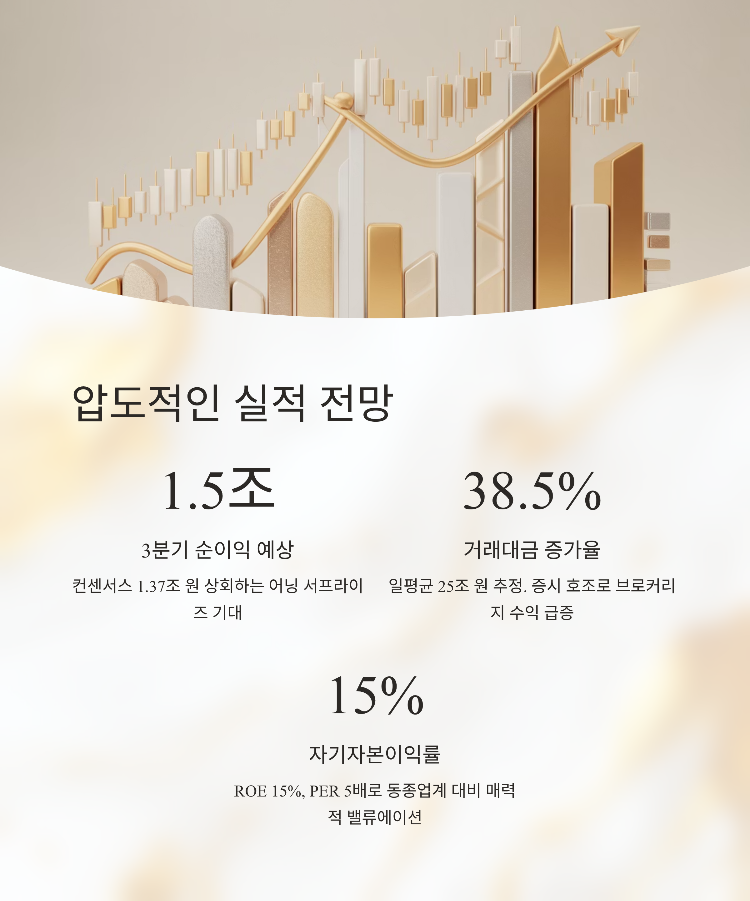 - 🚀 강력한 성장 동력: 우호적인 증시 환경 지속, 자본시장 선진화 및 기업금융 경쟁력 제고 방안 등 추가 성장 동력 확보에 따른 이익 확대 기대감이 높습니다.