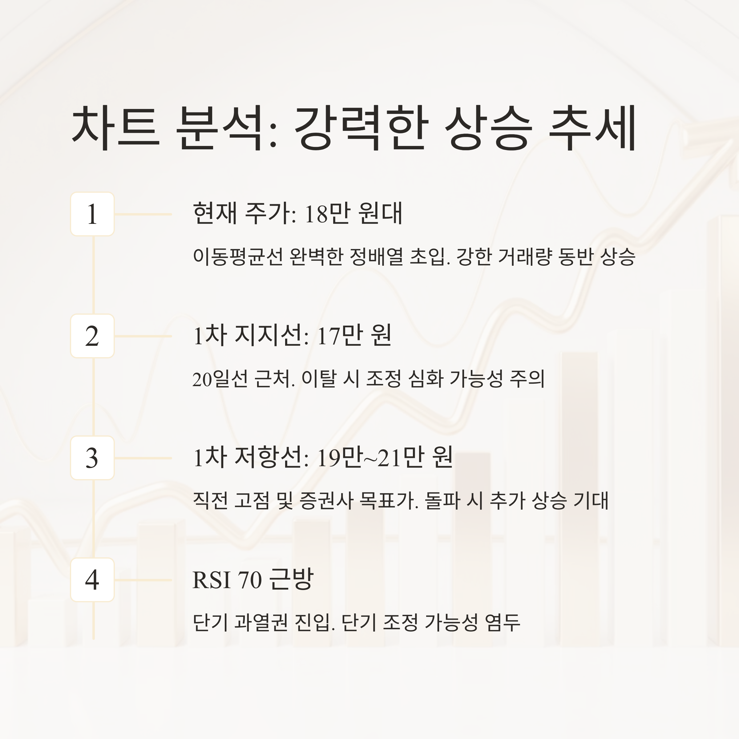 하지만 방심은 금물입니다. 차트가 우리에게 보내는 경고 신호도 분명히 있거든요. 현재 주가가 단기간에 급등했기 때문에 과열 구간(RSI 70 이상)에 진입했을 가능성이 높습니다. 이는 언제든 단기적인 되돌림 조정이 나올 수 있다는 경고입니다. 또한, 주가가 상승할 때마다 매물대 상단인 직전 고점(19만 원대)에서 강한 저항을 받을 수 있으므로, 이 가격대에서의 매도 물량 출현 여부를 주의 깊게 관찰해야 합니다.