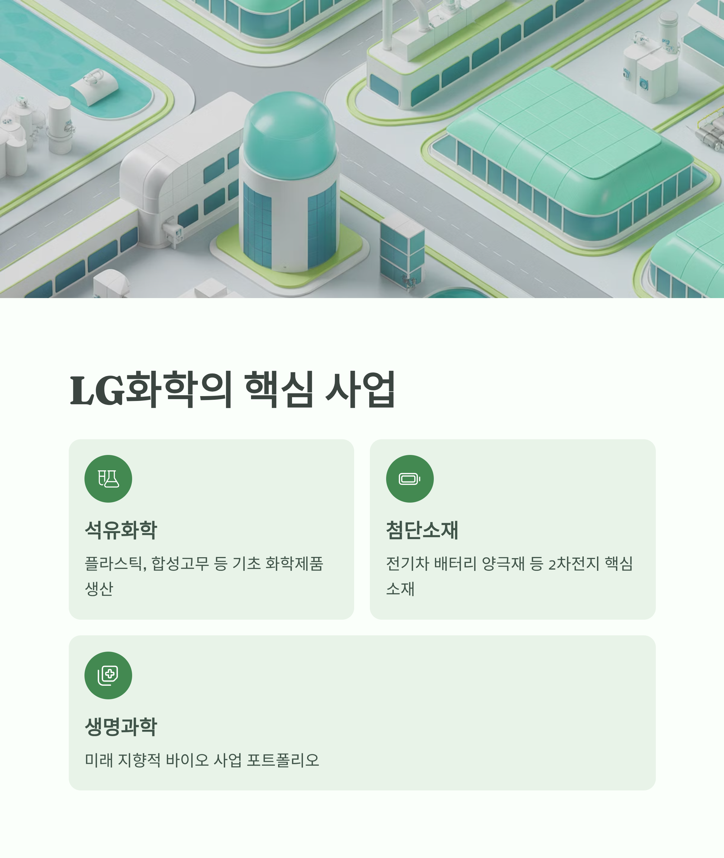| 주요 사업 분야 | 석유화학, 첨단소재(2차전지 양극재), 생명과학 | 미래 성장 동력은 첨단소재 | LG에너지솔루션 지분 보유 |