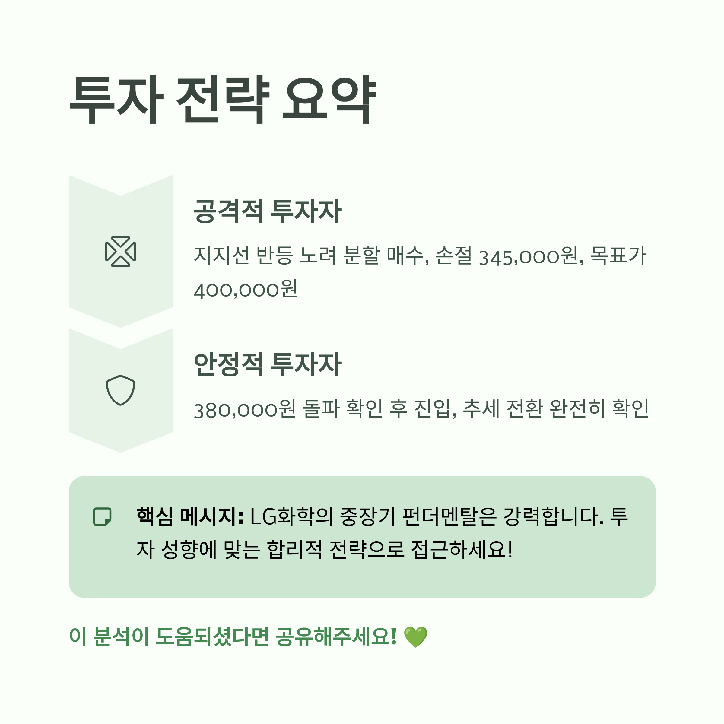 LG화학은 단기적인 시장의 우려를 안고 있지만, 중장기적인 2차전지 소재와 첨단 기술이라는 핵심 동력은 여전히 유효합니다. 따라서 현재의 주가 약세는 강력한 펀더멘탈 대비 주가가 과도하게 하락한 구간일 가능성을 내포합니다. 투자는 결국 개인의 성향에 맞춰 전략을 세우는 것이 중요합니다.