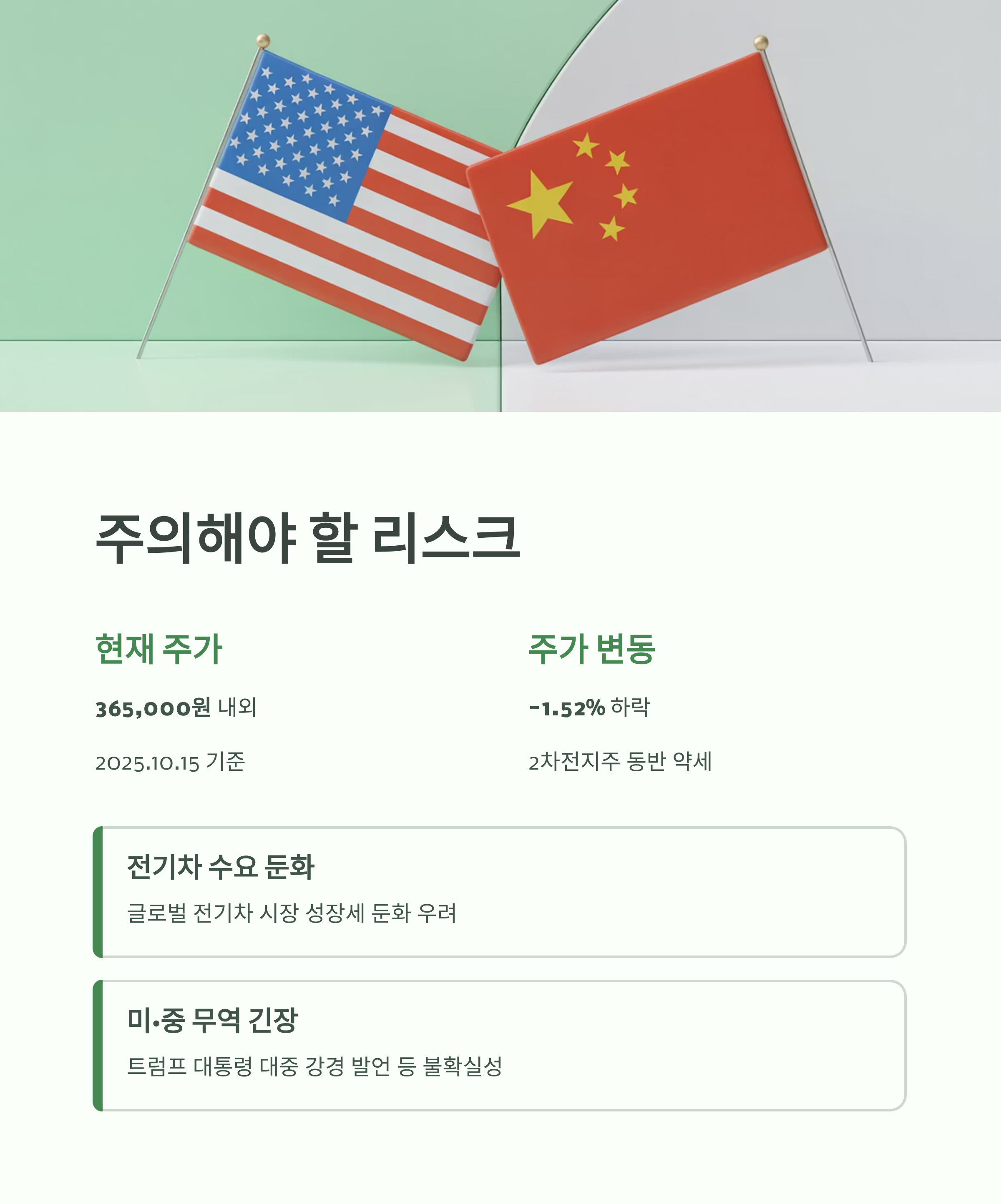 "물론 좋은 점만 있을 순 없겠죠? 우리가 반드시 체크하고 넘어가야 할 리스크 요인도 있습니다. 바로 전기차 수요 둔화 우려와 미·중 교역 불확실성 문제입니다. 이는 최근 주가 약세의 주요 원인이며, 트럼프 대통령의 대중 강경 발언 등 거시경제적 변수에 민감하게 반응할 수밖에 없습니다."