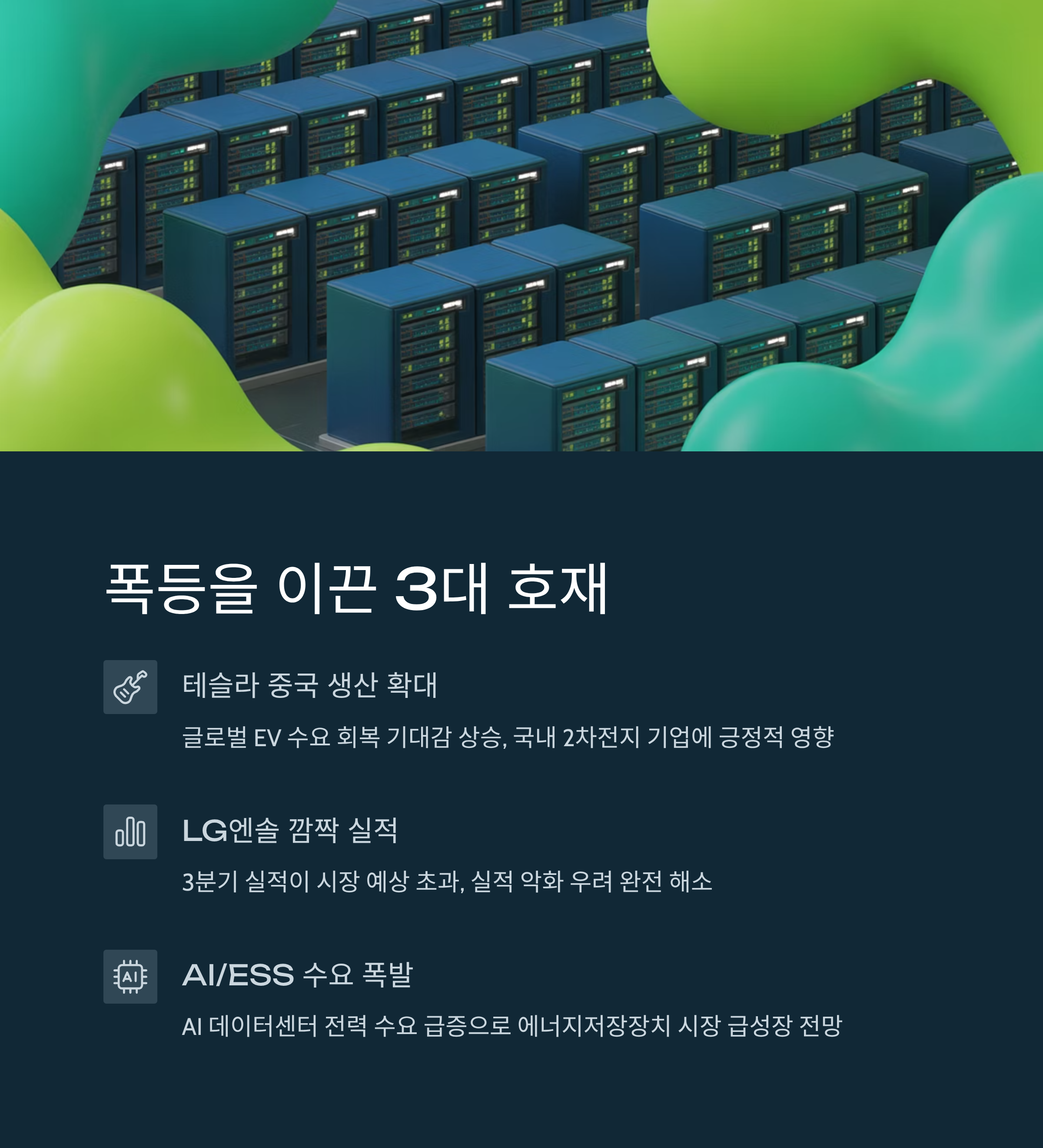 - 🥇 (3) AI 시대, ESS 수요 폭발: 인공지능(AI) 데이터 센터의 전력 수요 급증으로 에너지저장장치(ESS) 시장이 급성장할 것이라는 전망이 나오면서 2차전지의 새로운 성장 동력으로 부각되고 있습니다.