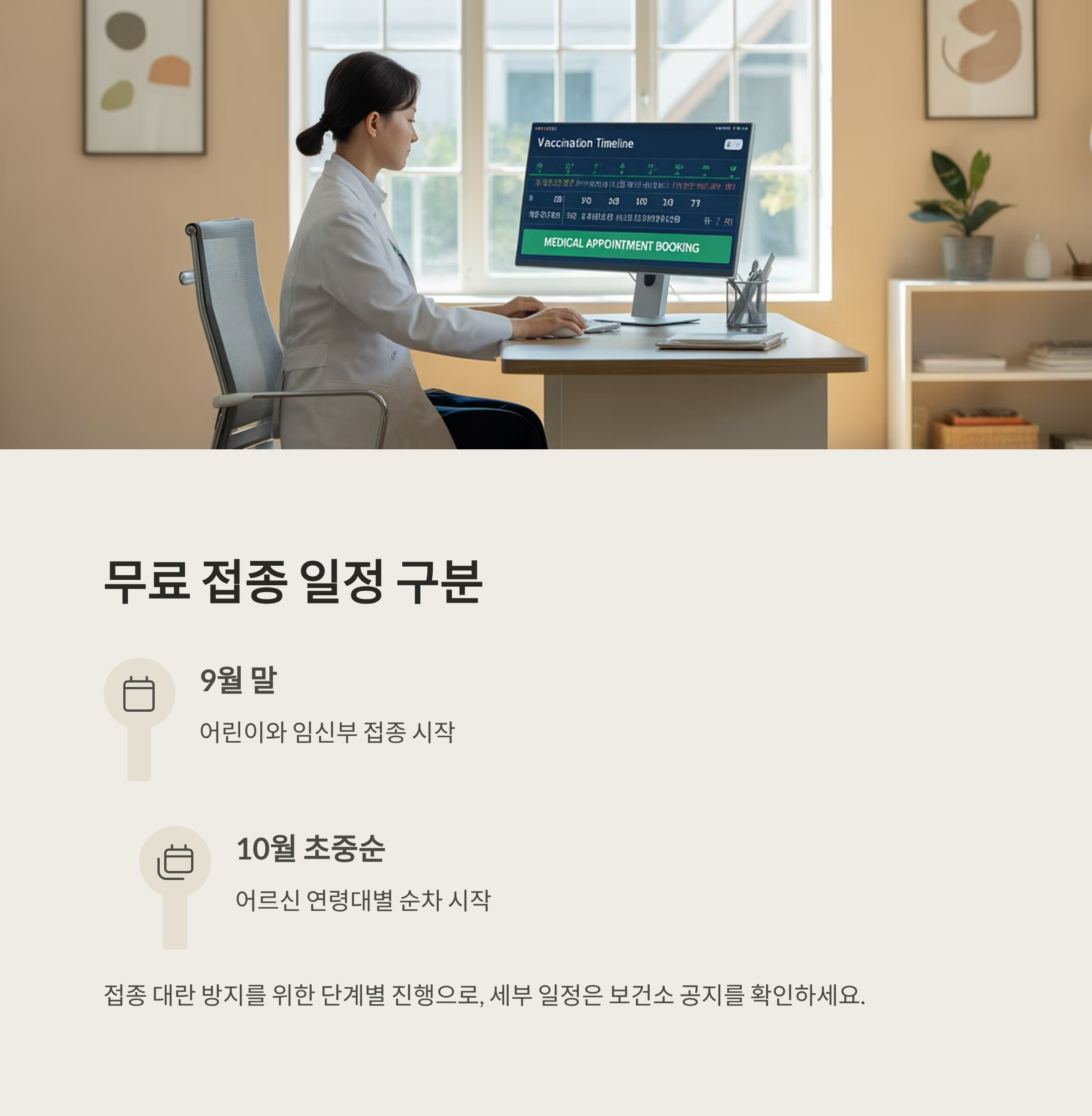 무료 대상자는 나이에 따라 접종 시작일이 달라집니다. 어린이와 임신부는 9월 말부터 시작하며, 어르신은 연령대별로 10월 초~중순에 순차적으로 시작합니다. 이는 접종 대란을 방지하기 위한 조치로, 세부 일정은 각 보건소 및 복지부 공지를 통해 확인할 수 있습니다.