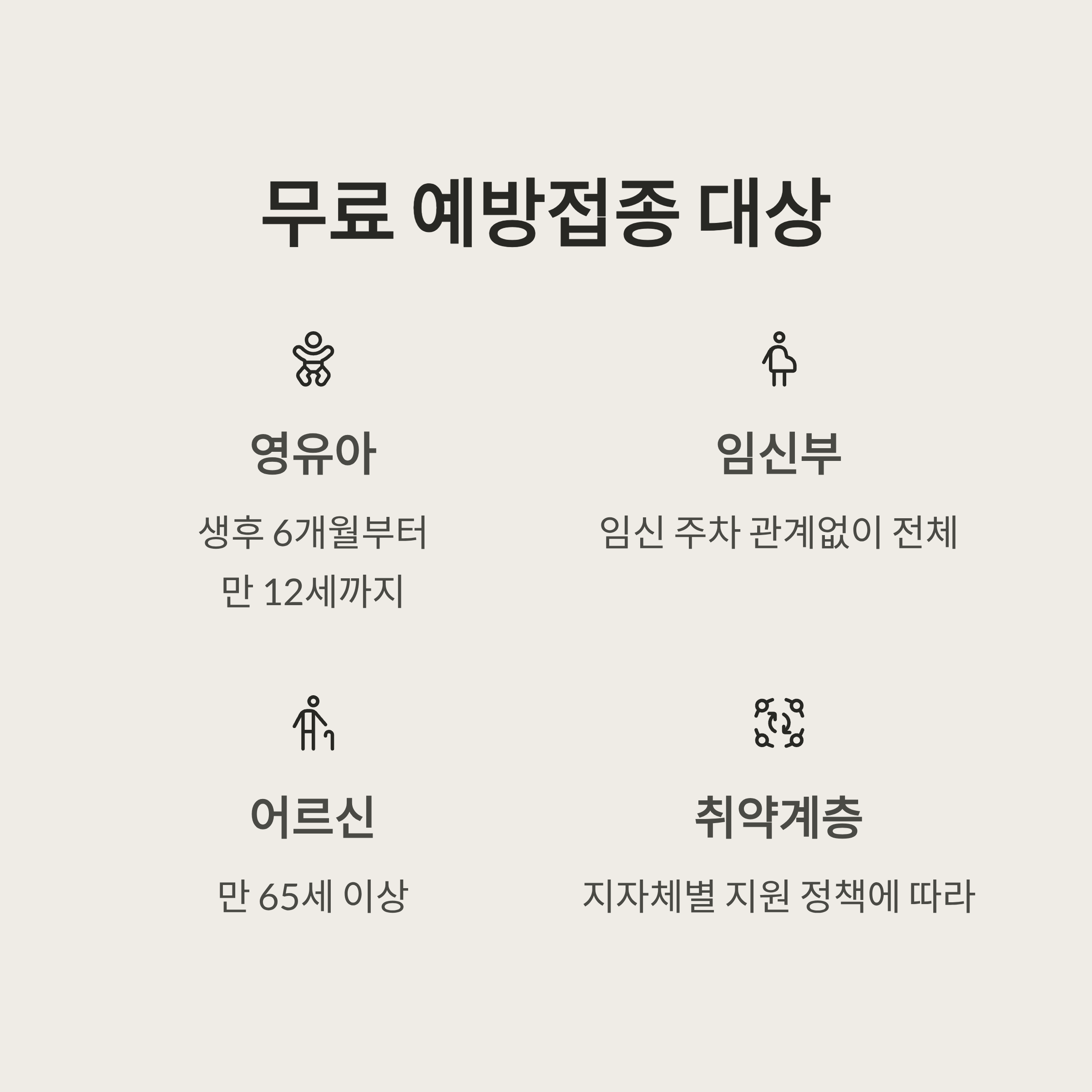 2025년에도 국가 무료 지원 대상은 예년과 동일하게 운영됩니다. 아래 조건에 해당하는 분들은 지정 의료기관에서 무료로 접종 가능합니다.