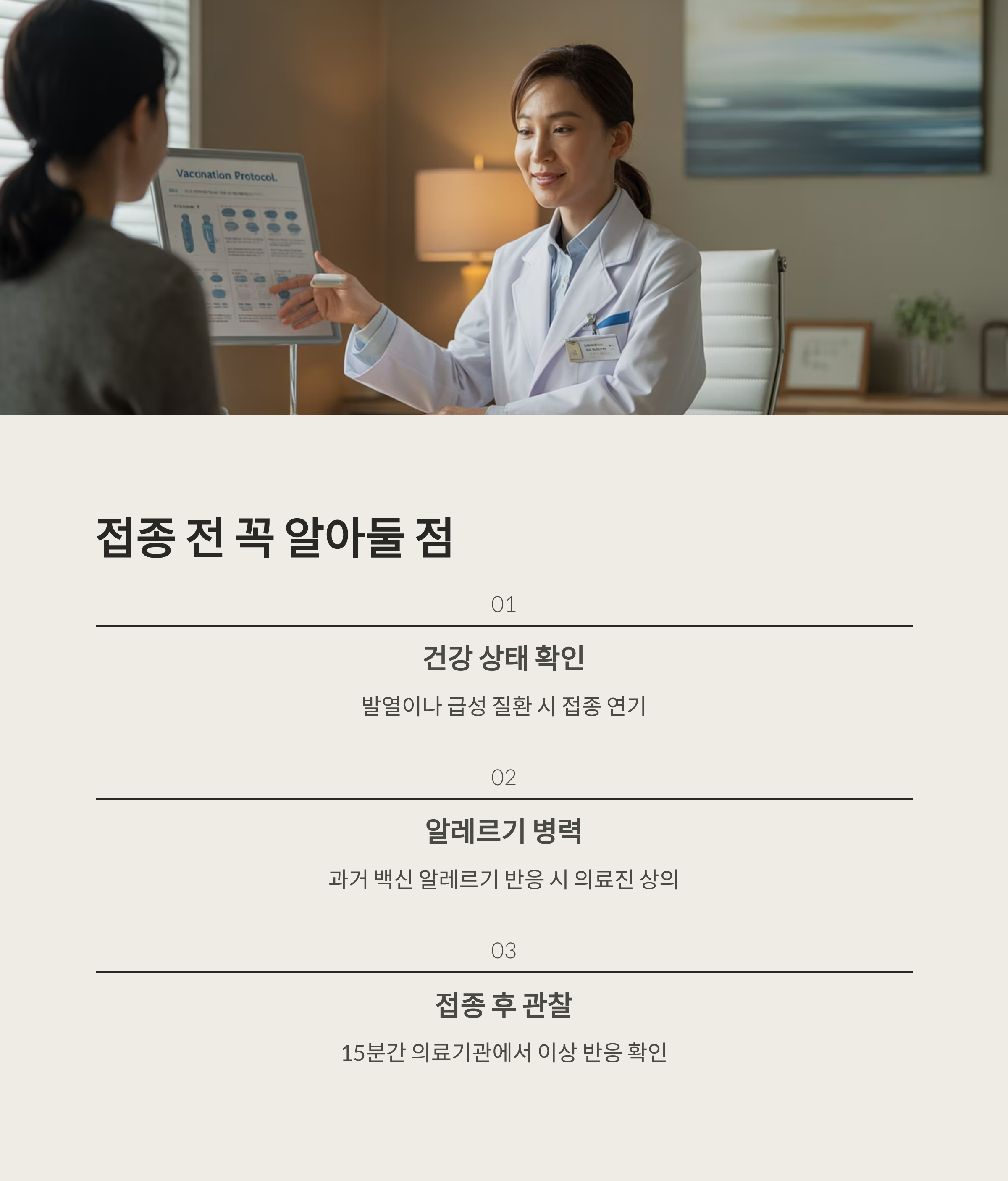 예방접종 전에는 반드시 건강 상태를 확인해야 합니다. 발열이나 급성 질환이 있는 경우 접종을 미루는 것이 좋고, 과거 백신 접종 후 심한 알레르기 반응이 있었다면 의료진과 충분히 상의해야 합니다. 접종 후에는 15분 정도 의료기관에 머물며 이상 반응 여부를 확인하는 것이 안전합니다.