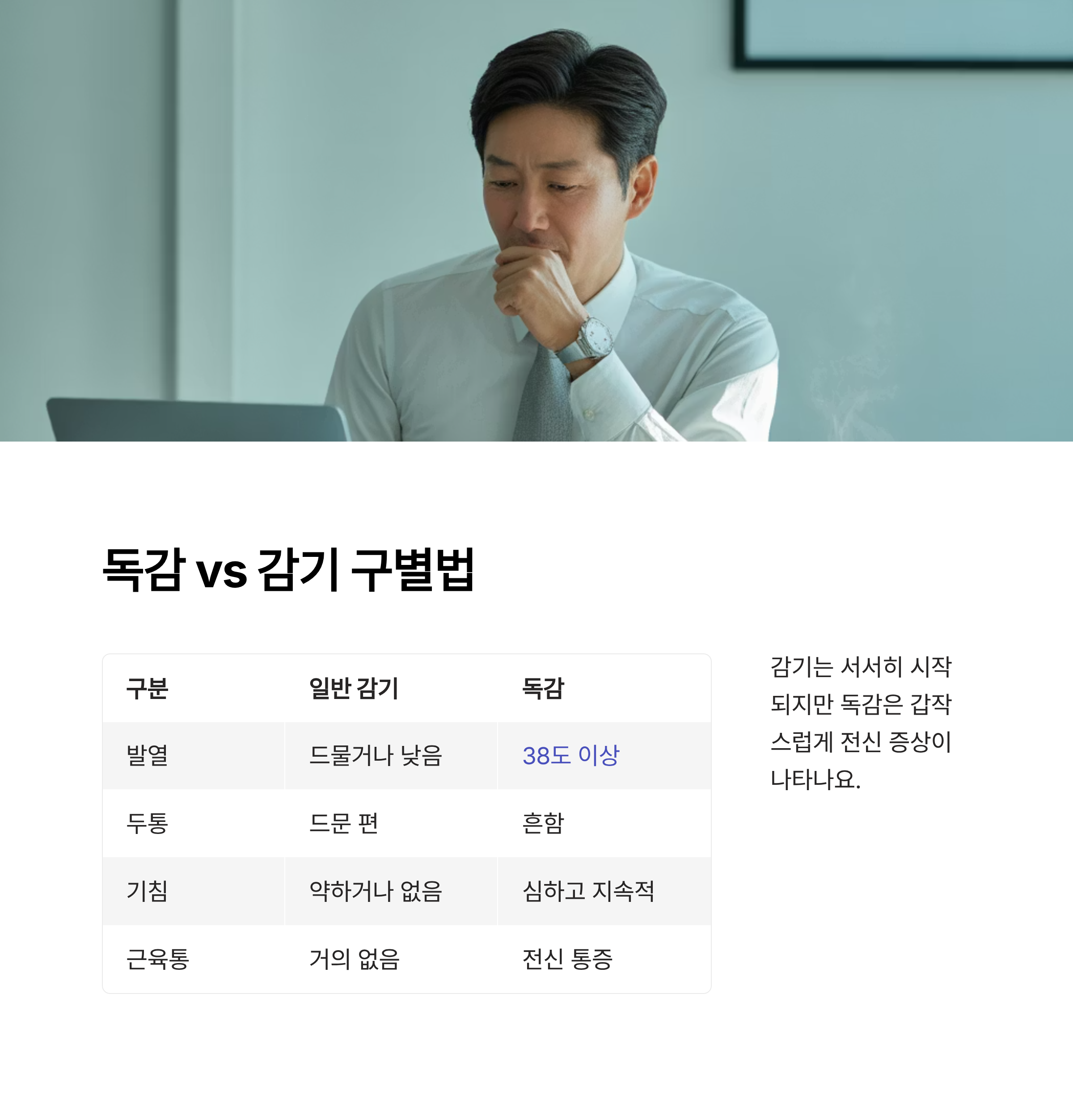 반면 독감은 갑작스럽게 발열과 함께 전신 증상이 나타나죠.